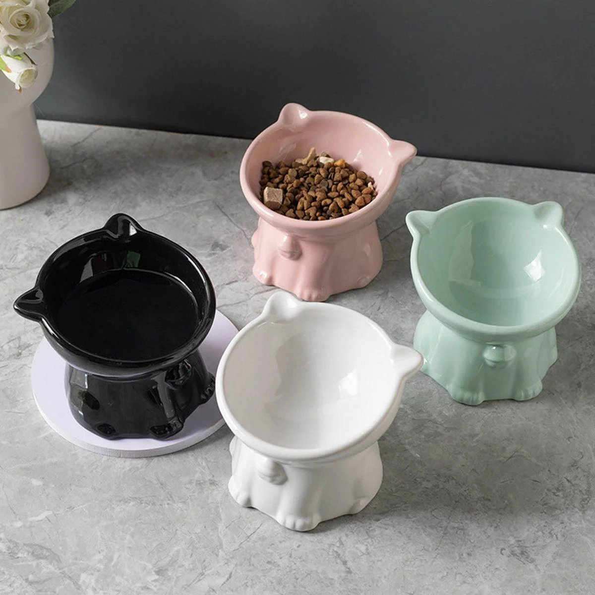 This ceramic cat bowl is thoughtfully designed with a 15° tilt angle to support your feline's spine health and improve digestion. The elevated and ergonomic design encourages a comfortable eating position, making mealtime stress-free. Crafted from premium quality ceramic, the bowl is sturdy, durable, and safe for food use. Its adorable cat-shaped design adds a playful touch to your home decor while serving as a functional accessory for your pet.