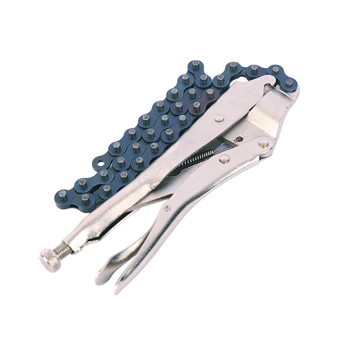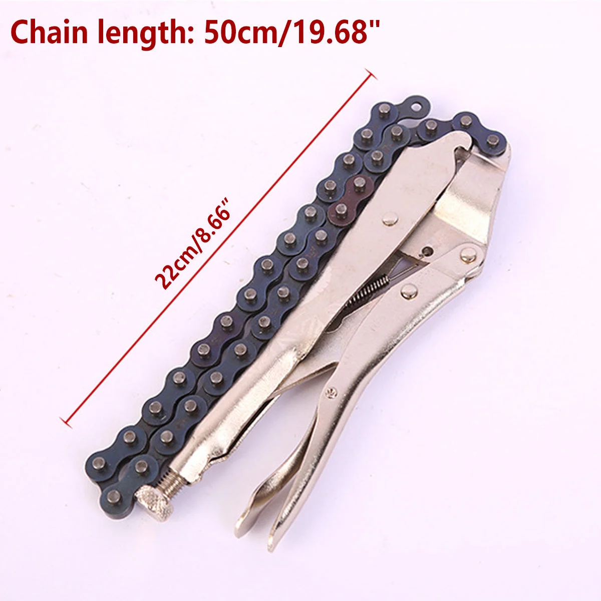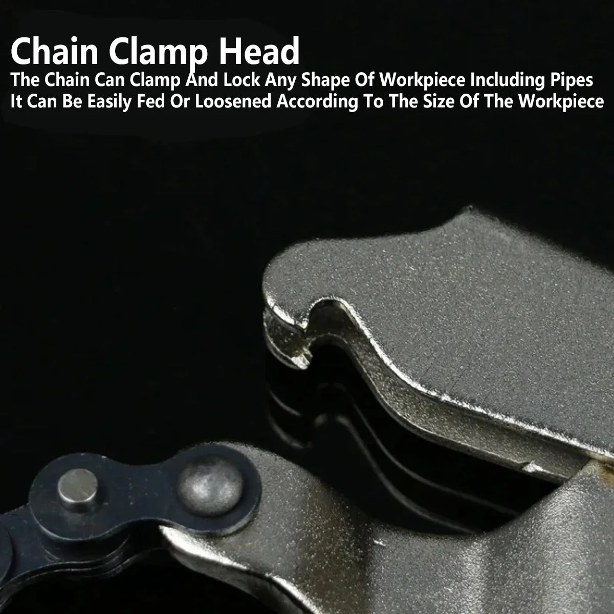This multi-functional chain locking pliers tool is designed for securely clamping and holding pipes, compressors, and irregular objects.Made of high-carbon steel with a spray-coated handle, it features a 50cm chain for flexible adjustment, screw-controlled grip strength, and a quick-release trigger for safe, efficient operation in repair or assembly work.