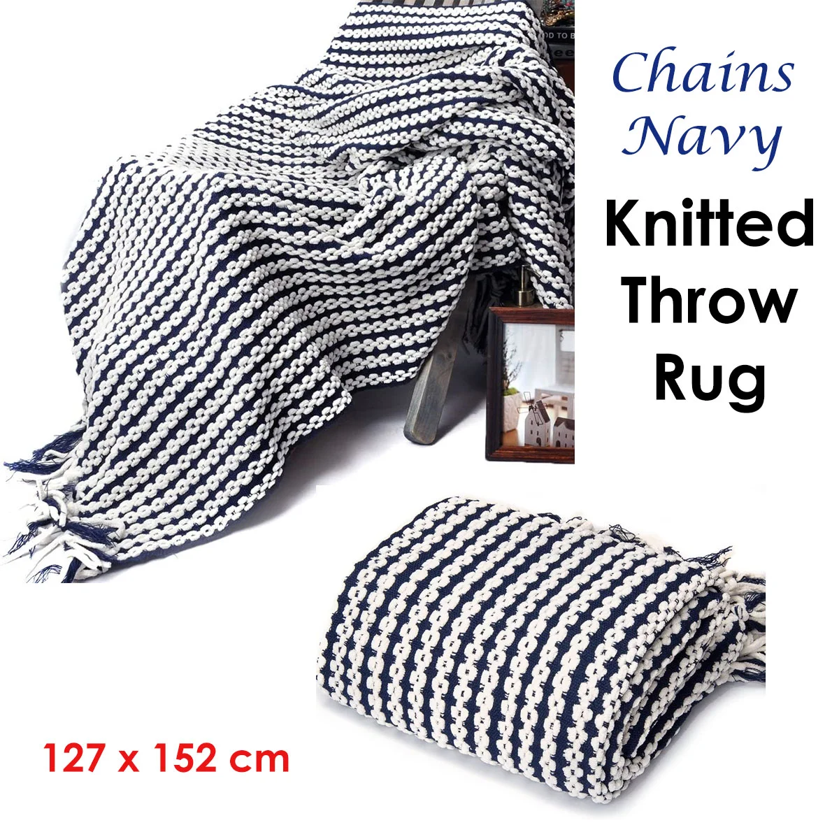 This Chains Navy Knitted Throw Rug 127 x 152 cm is soft to the touch and will enhance any home decor. It features a chain knitted design in navy and cream colour tones that will complement most interior styles. Perfect to drape it across your bed or chair to add a relaxed yet elegant appeal. It is made from lightweight and breathable acrylic/polyester fabric with long lasting quality.