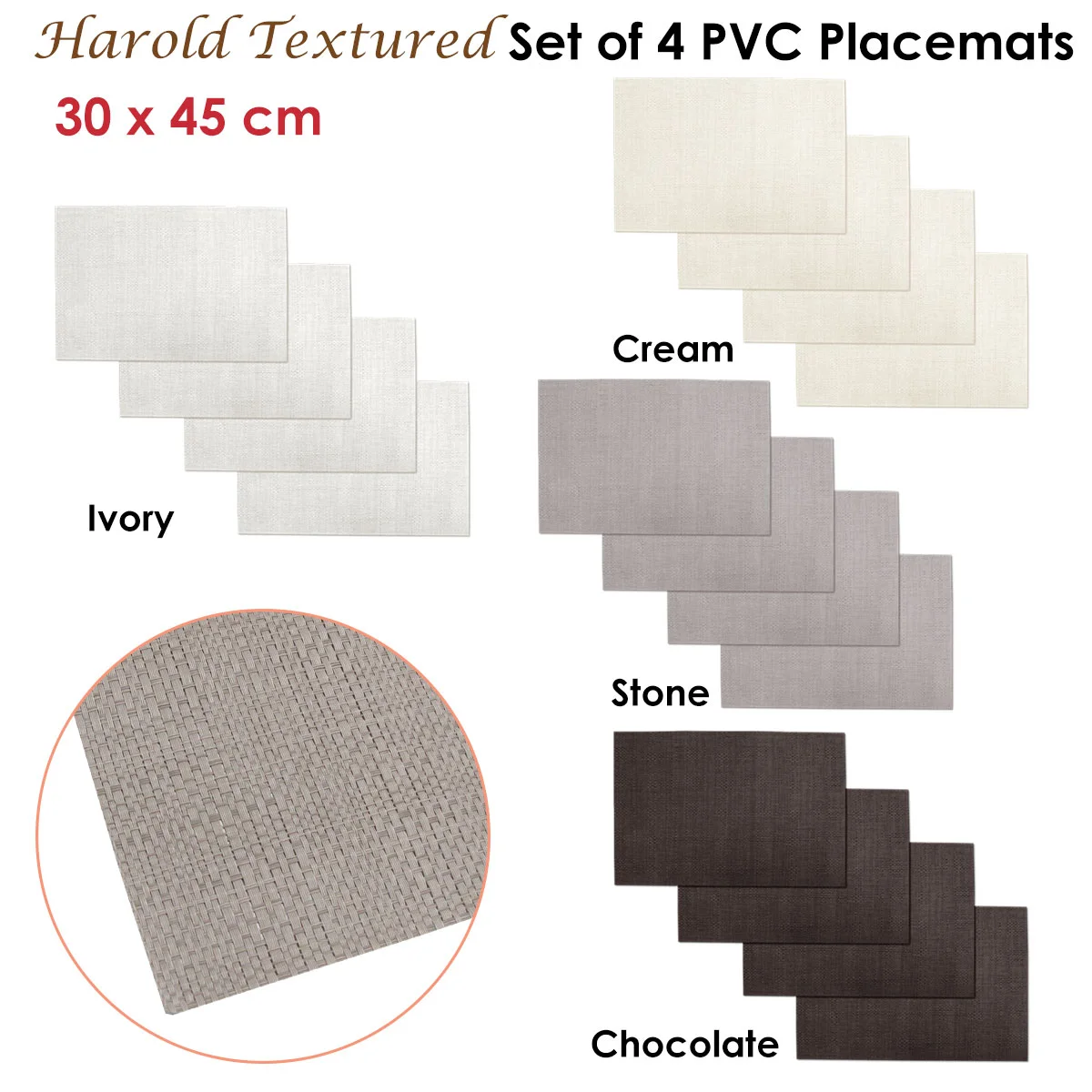 Make your dining table look more luxurious and eye-catching with this Set of 4 Harold Textured PVC Table Placemats 45 x 30 cm by Choice. Placemats are must-have kitchen accessories to protect your dining table from heat damage, water marks, and food stains. It features a textured basketweave design in soft neutral colour tones that will make eating more enjoyable. It is made from easy care and durable PVC material.