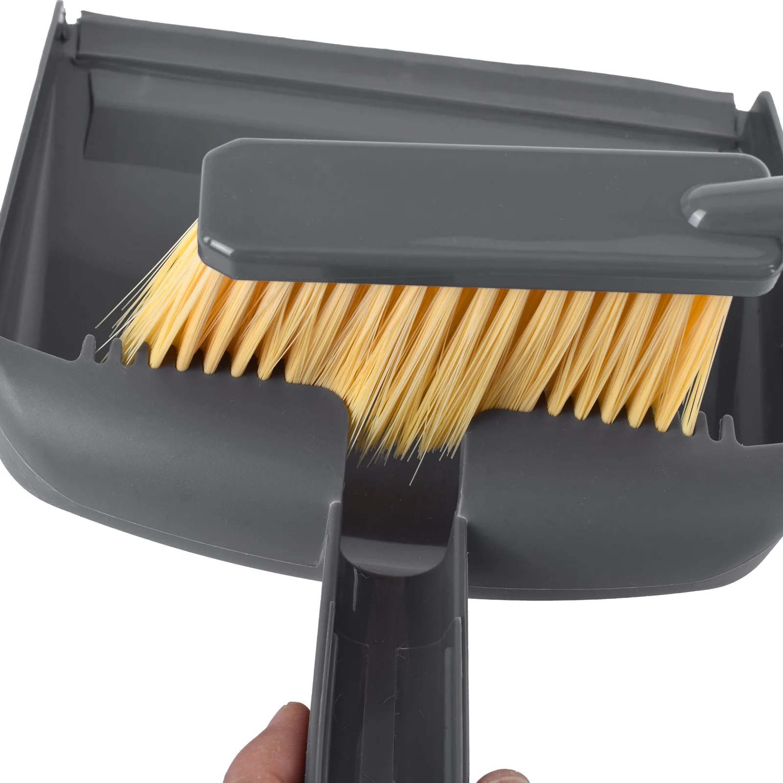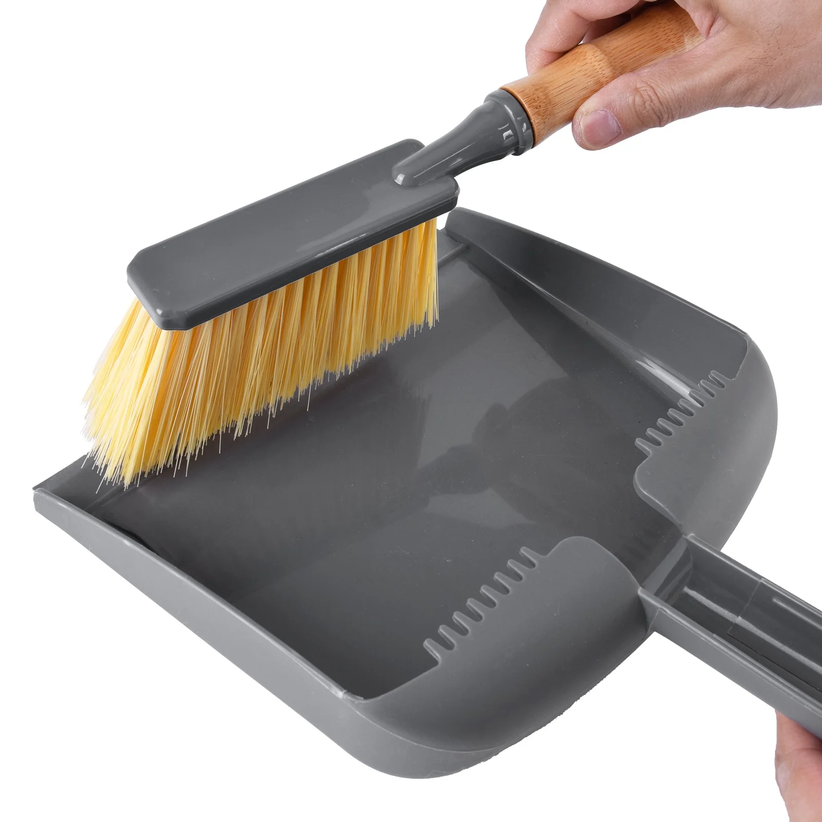 Set includes dustpan with built in scraper and natural bamboo handled brush with soft recycled, durable PET bristles.