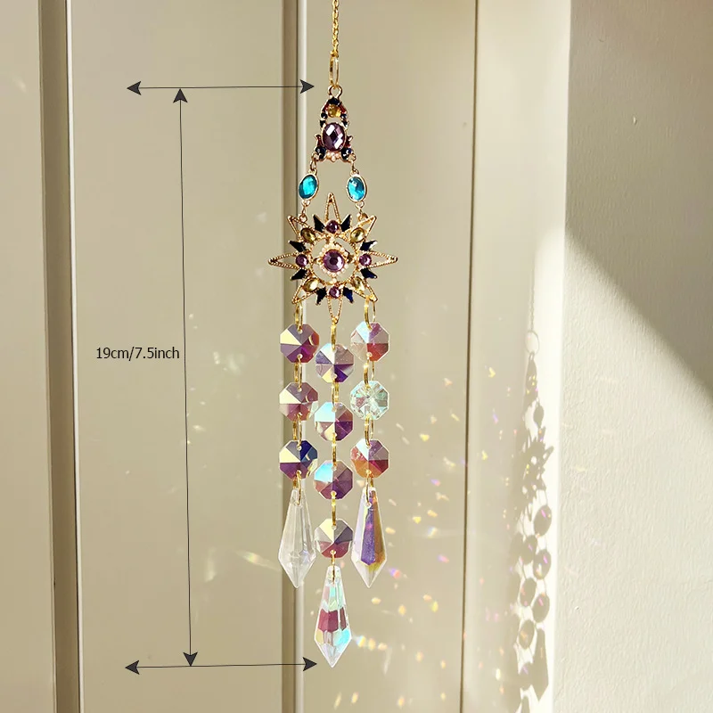 Invite a touch of magic and a cascade of beautiful rainbows into your home with our enchanting Celestial Crystal Suncatcher. When kissed by the sun, this exquisite ornament comes to life, scattering vibrant light and cheerful colours throughout your space. It is a stunning piece of decor that brings joy and wonder to any room.