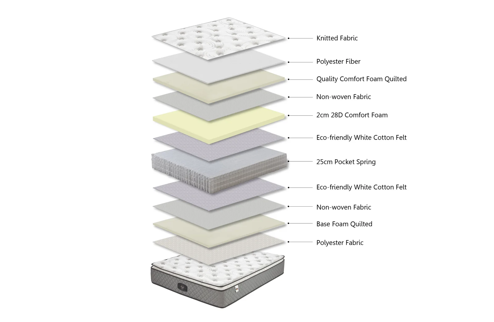 Experience luxurious sleep with the Comfort Euro Top 30cm Pocket Spring Mattress, featuring a breathable knitted fabric top layer, 3cm foam and fibre quilting, a 2cm 28D comfort foam layer, and a 24cm pocket spring core for optimal support and pressure relief. Available in King Single (107cm x 203cm x 30cm), Double (137cm x 188cm x 30cm), Queen (152cm x 203cm x 30cm), and King (183cm x 203cm x 30cm) sizes, this mattress also boasts a durable polyester fabric bottom layer and convenient vacuum-compressed and rolled packaging for easy delivery and setup.