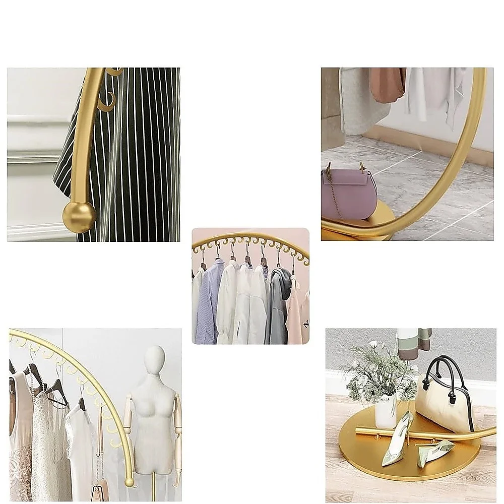 Presenting a premium modern-style display stand, this hanger is crafted from high-quality metal with a robust hook. The high-temperature spray painting process ensures durability and prevents deformation, while pickling and phosphating contribute to a long-lasting finish. The frosted non-slip storage pole design enhances windproof and reinforcement features, accommodating clothes of various lengths for easy daily hanging and storage. The round metal base provides stability for your decorations without causing damage to your clothes, making it suitable for different decoration styles.