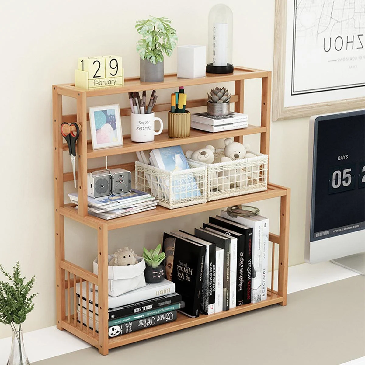 This 3-tier bamboo desktop bookshelf is an elegant and functional solution for organizing your workspace. Made from high-quality natural bamboo, it offers a sturdy yet stylish storage option for books, stationery, and small decorative items. Its minimalist design is ideal for compact spaces like desks, dormitories, or children's rooms. The polished surface and smooth edges ensure safety and a premium appearance, while the side guard rails help prevent items from toppling over. This bookshelf is perfect for those looking to reduce clutter while adding a natural touch to their workspace.