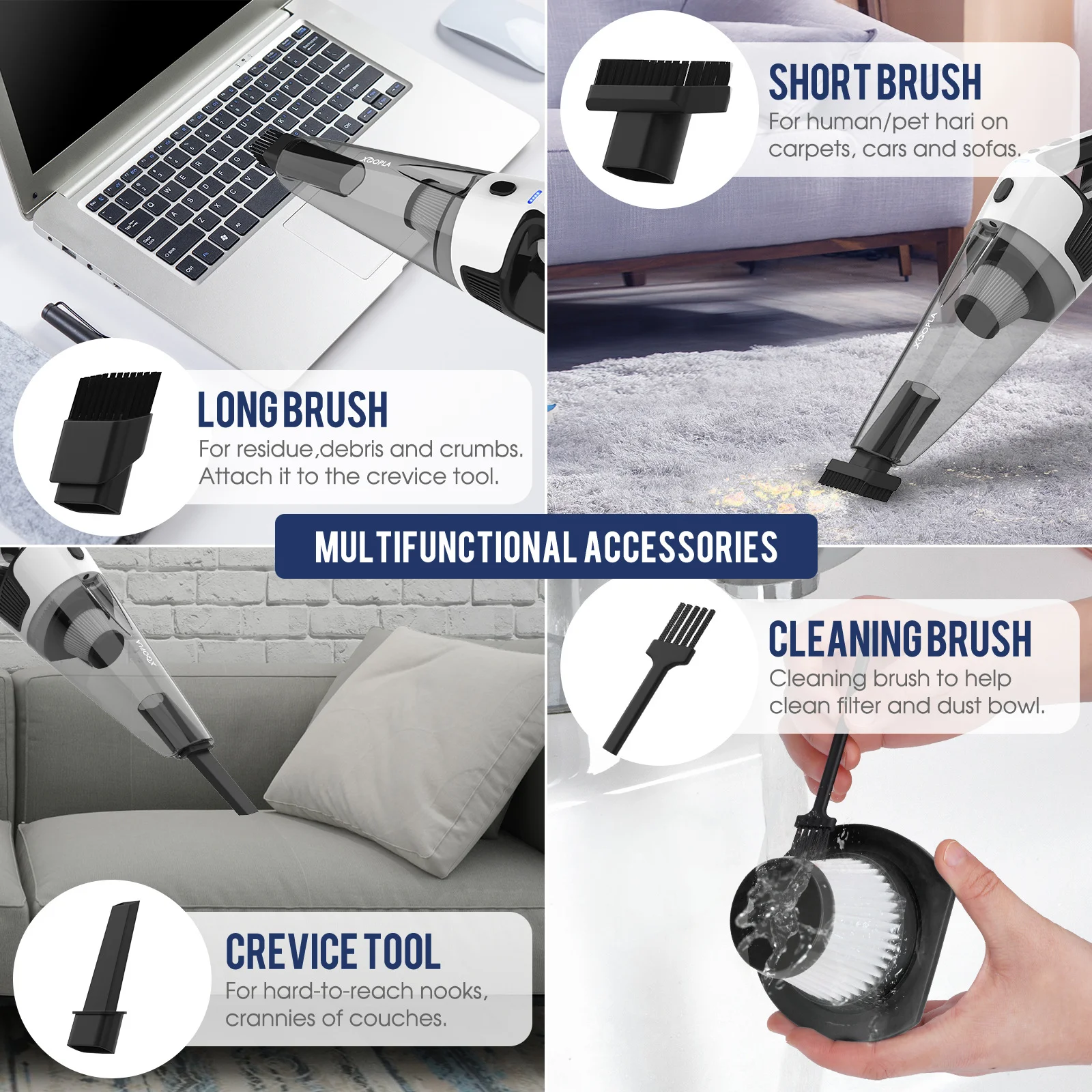 Keep your car and home spotless with our powerful Corded Handheld Vacuum Cleaner. Engineered with a 120W surging power motor, this vacuum delivers an impressive 10kPa of strong suction, making it perfect for picking up dust, pet hair, crumbs, and other debris from various surfaces. The built-in LED light illuminates dark corners, ensuring no dirt is missed, while the low-noise design provides a more pleasant cleaning experience. This vacuum features a premium H12 HEPA filter that is both reusable and washable, offering excellent filtration. It comes with a suite of multifunctional accessories, including a long brush, short brush, and a crevice tool, to tackle any cleaning task. The easy-to-empty dust cup and simple assembly make maintenance a breeze. Powered by a long car charger cord, it's always ready for a deep clean.