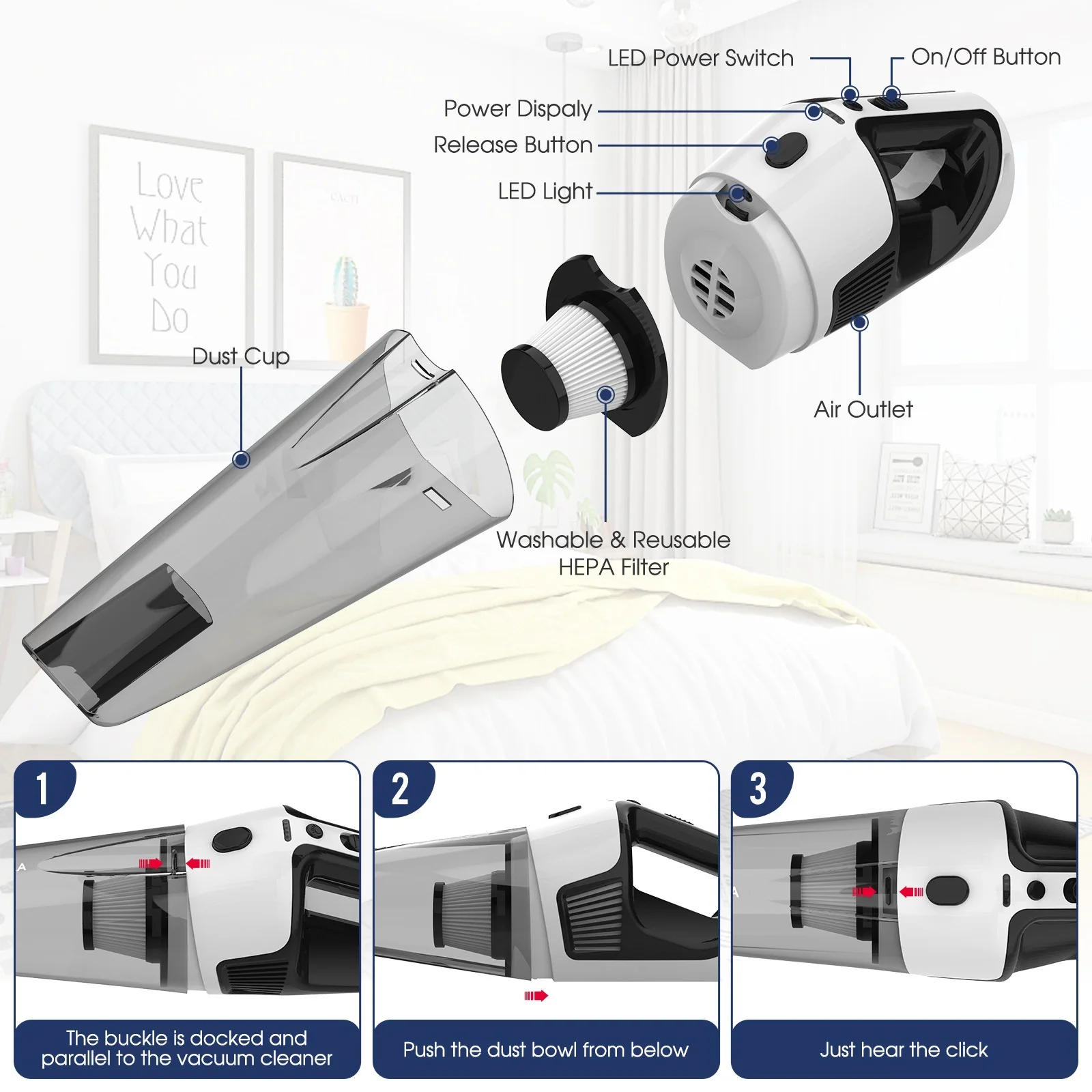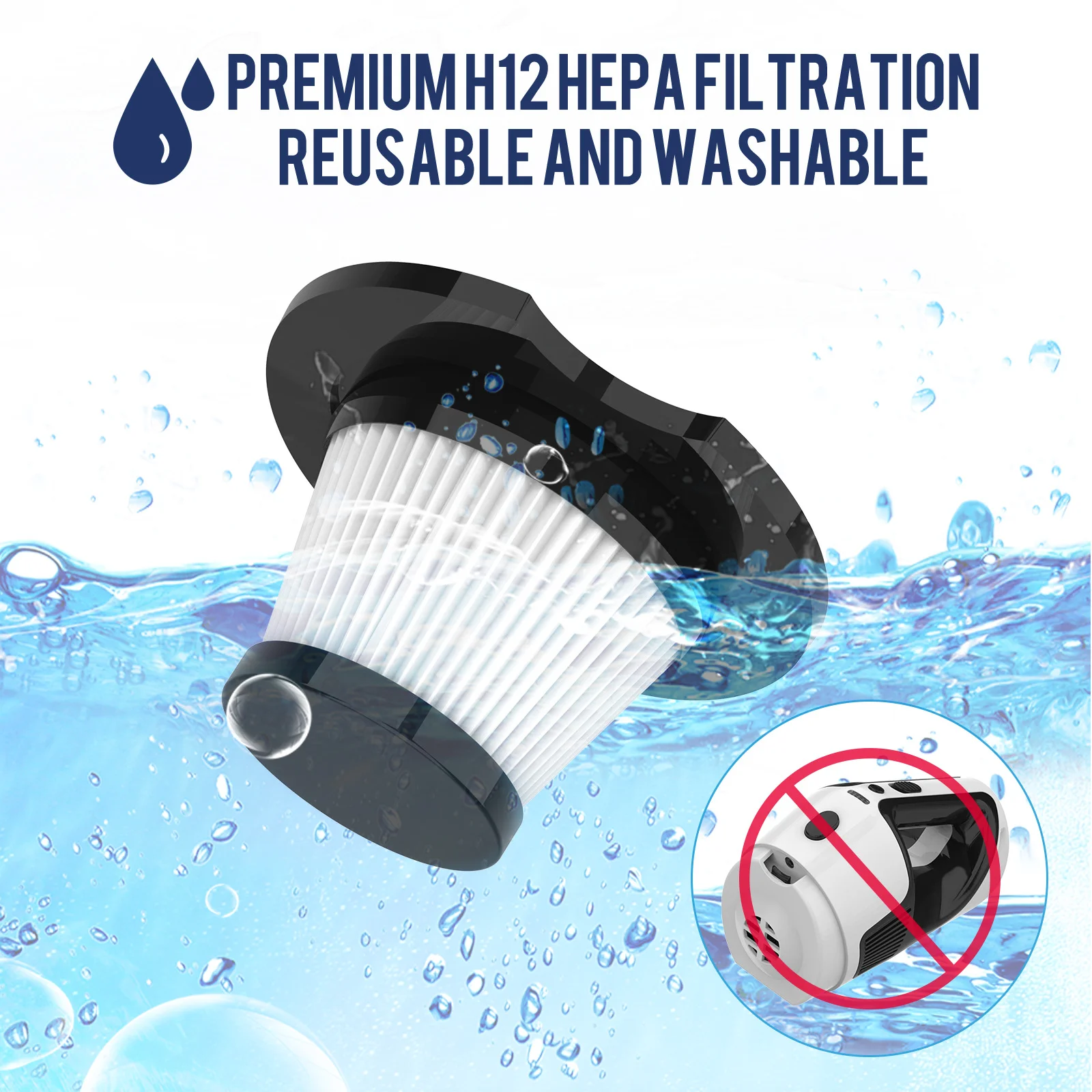 This product does not contain a lithium battery. Ensure the HEPA filter is completely dry after washing before reinstalling it into the vacuum to avoid damage to the motor. Do not immerse the main motor unit in water. This vacuum is designed for 12V car power outlets. Check your vehicle's power outlet specifications. Empty the dust cup regularly to maintain optimal suction performance.