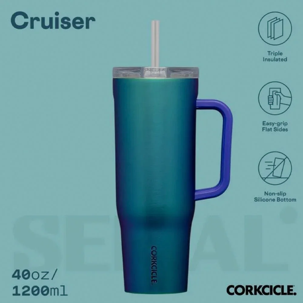 Corkcicle Cruiser - 1.2ltr Unicorn Magic. Hit the road, trail, or wherever the day takes you—hydrated and in style. The Cruiser is our biggest straw cup yet, holding 1.2L (40oz) of your favorite beverage and keeping it cold for up to 20 hours or hot for up to 9. Whether it’s your daily commute or a weekend escape, Cruiser is designed for maximum comfort and minimal fuss. It features a spill-proof, dual-function lid for sipping or using the straw, a soft-grip handle for easy carrying, and a non-slip silicone bottom that stays steady no matter how bumpy the ride.