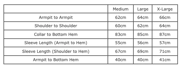 | Sleeve Length (Armpit to Hem) | 55cm | 56cm | 57cm |