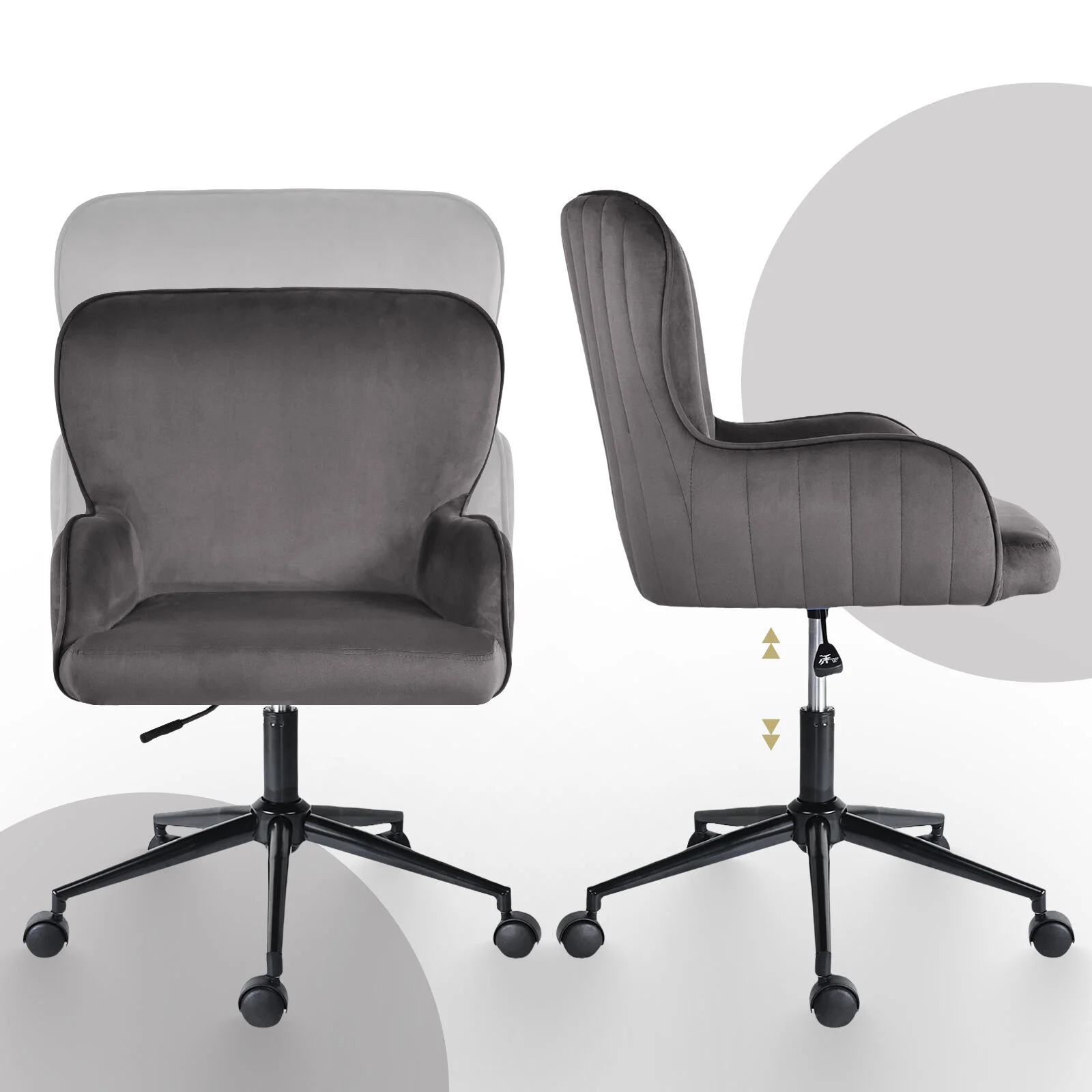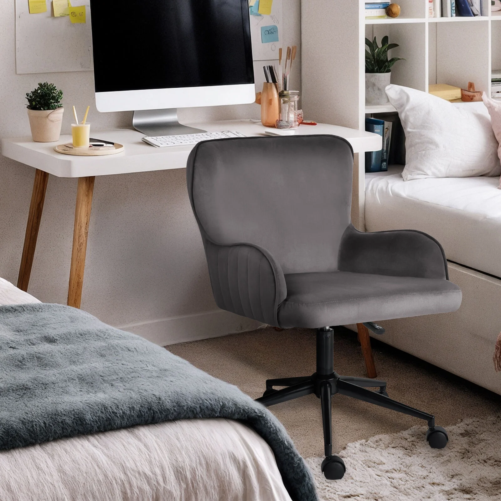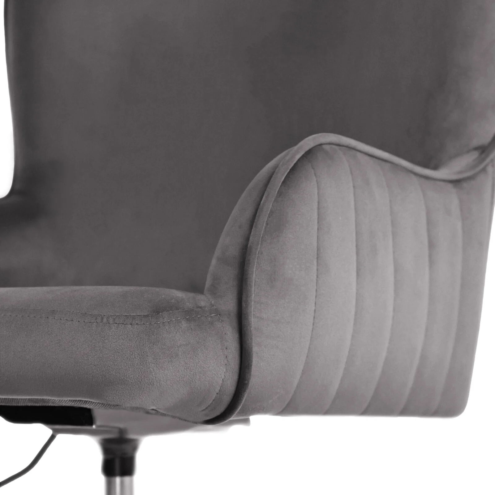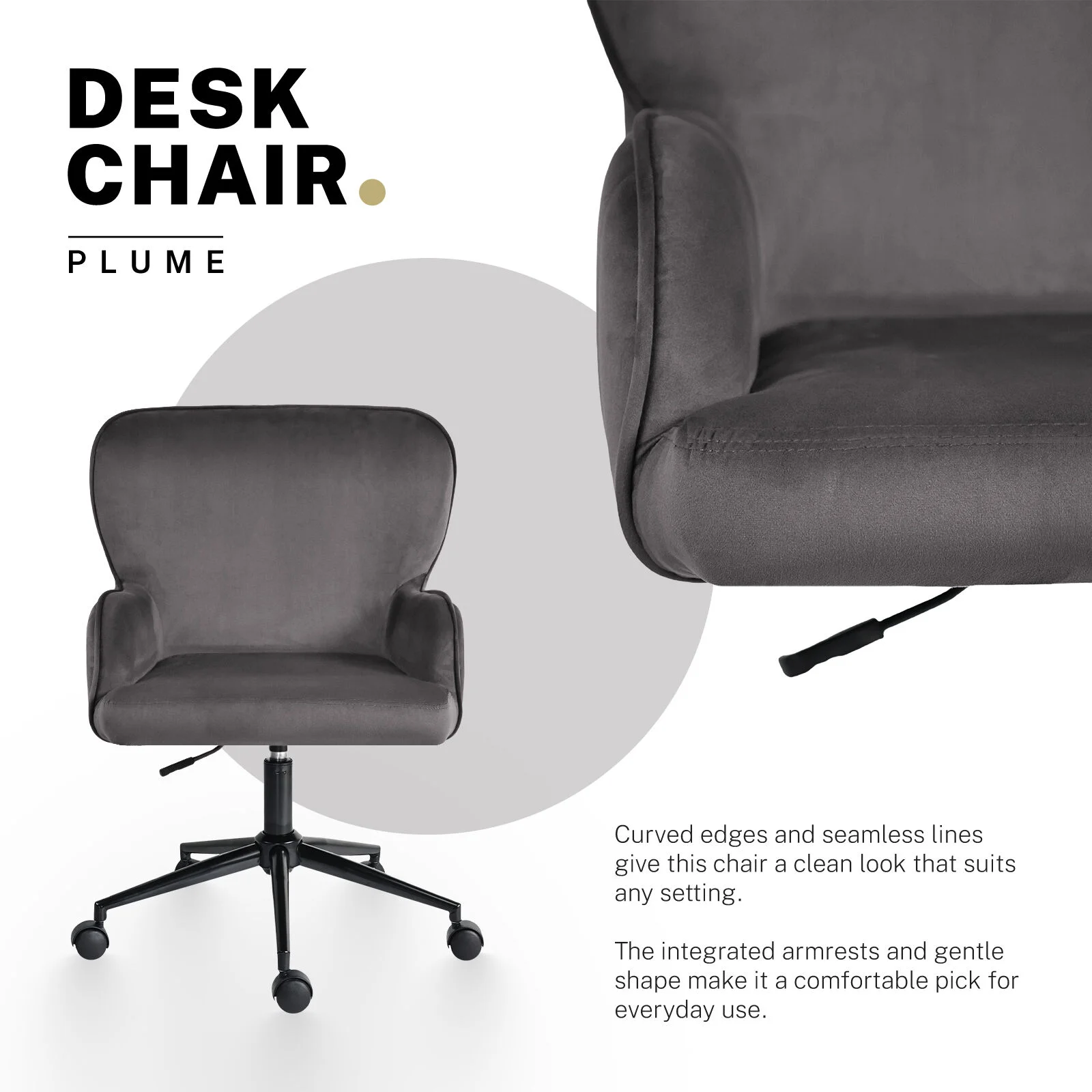 Blending soft curves with a smooth velvet finish, this chair offers both style and comfort. The cushioned seat and contoured armrests support you through work sessions, study hours or quiet breaks, while the swivel base and height adjustment keep you sitting just right.