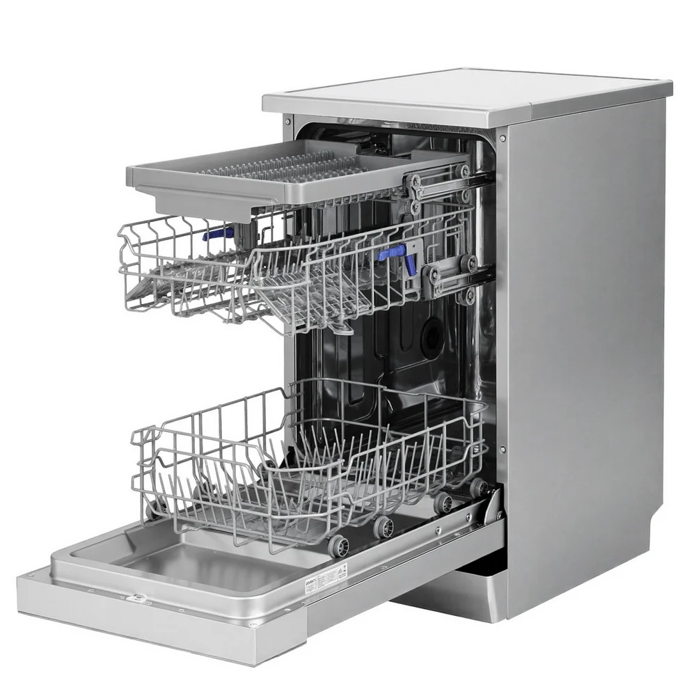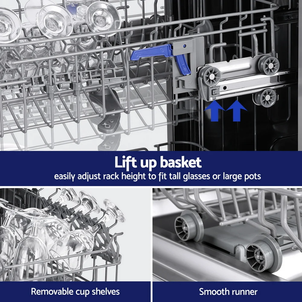 With a large capacity and freestanding design, it's perfect for handling everyday loads of plates, glasses, pots, and pans. The lift-up basket lets you easily adjust rack height to fit tall glasses or large cookware, giving you greater flexibility for every wash. This quiet-operation dishwasher offers 8 cleaning programs, including 24-hour delay start, extra cleaning, and drying functions. The intuitive LED display with clear indicators makes operation simple and hassle-free, while the add-in feature lets you place forgotten dishes mid-cycle.For superior results, it uses a hot water cleaning function, heating cold water directly from the inlet hose for effective cleaning and longer hose durability. Make post-meal clean-up a breeze with the Devanti 10 Place Setting Dishwasher – efficient, flexible, and built to simplify your kitchen routine.