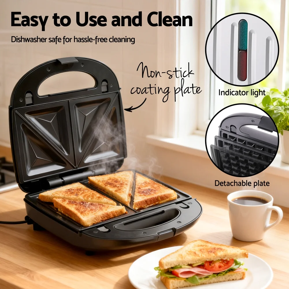 Start your mornings right with the Devanti 3-in-1 Sandwich Maker, a versatile appliance designed to prepare delicious meals in minutes. This multifunctional unit works as a sandwich maker, waffle maker, and panini press, giving you more options without cluttering your kitchen. Equipped with an 850W high power heating system, it heats up quickly and ensures fast, even cooking. The double grill plate and double-sided baking design deliver crispy sandwiches, golden waffles, and grilled beef or sausage every time.