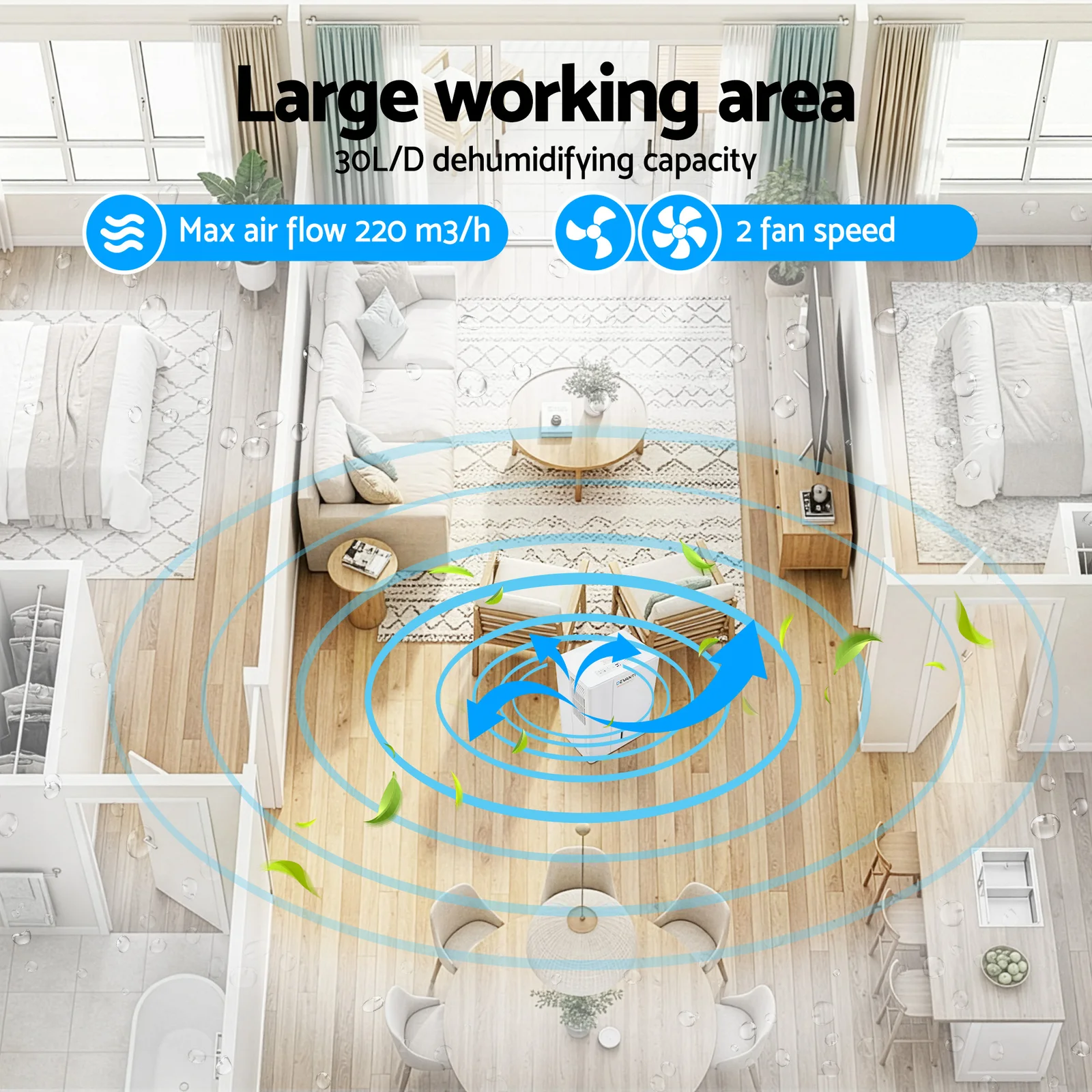 Devanti 30L Dehumidifier & Air Dryer Create a healthy home with this 30L/day moisture absorber. Perfect for medium-large rooms, it features 4 modes including 'Strong' for fast laundry drying and 'Ventilation' for airflow. The stylish hidden front display monitors humidity in real-time. Equipped with a 4.7L water tank and a 101cm hose for continuous drainage. Enjoy whisper-quiet Sleep Mode (≤47dB), 24h timer, and power failure memory. Portable on easy-roll casters, this R290 eco-friendly unit is your solution to mould and damp.