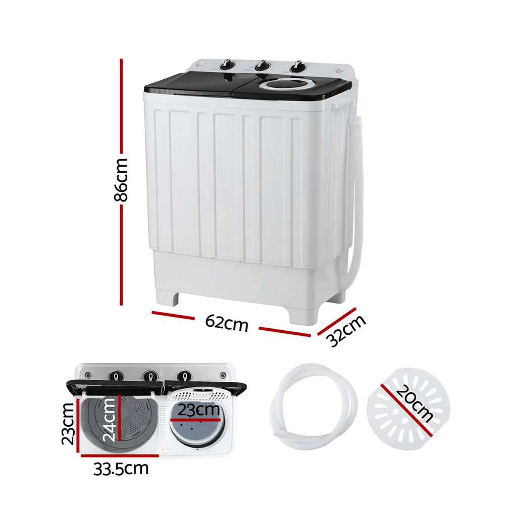 Unleash the power of convenience with our Devanti Portable Twin Tub Washing Machine. Designed for efficiency and ease of use, it features a generous 7kg washing capacity and 4kg spinning capacity—perfect for handling daily laundry in a single go. Its twin tub design allows you to wash and spin simultaneously, saving you valuable time and effort. With its powerful dual motor system, this machine boasts 380W washing power and 160W spinning power. The intuitive three-knob control panel with Gentle/Normal/Drain modes ensures simple operation for everyone, even the elderly. Separate timers for washing (up to 15 minutes) and spinning (up to 5 minutes) give you complete control over your laundry cycle. Its compact, lightweight, and no-installation design makes it ideal for small spaces, offering a convenient, space-saving solution to your laundry needs. No installation is required—just plug it in and get started.