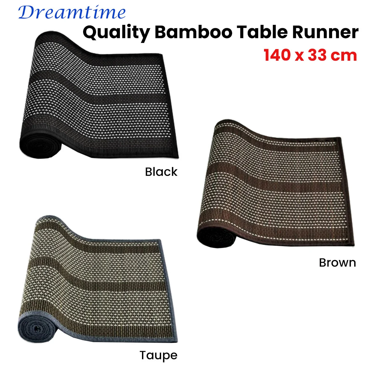 This Dreamtime Bamboo Table Runner 140 x 33cm is perfect for those who love simplicity and versatility. It features woven design in neutral colour tones that can can easily complement any style or occasion. With woven non-skid backing. Made from quality bamboo and polyester materials with easy care properties for long lasting use.