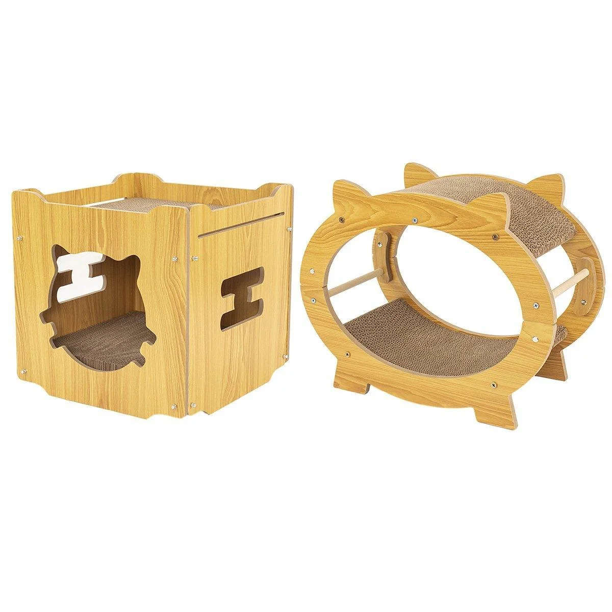 Discover the ultimate cat lounge with our square and oval scratchers. Crafted from natural wood and robust corrugated cardboard, they offer a perfect blend of durability and elegance.