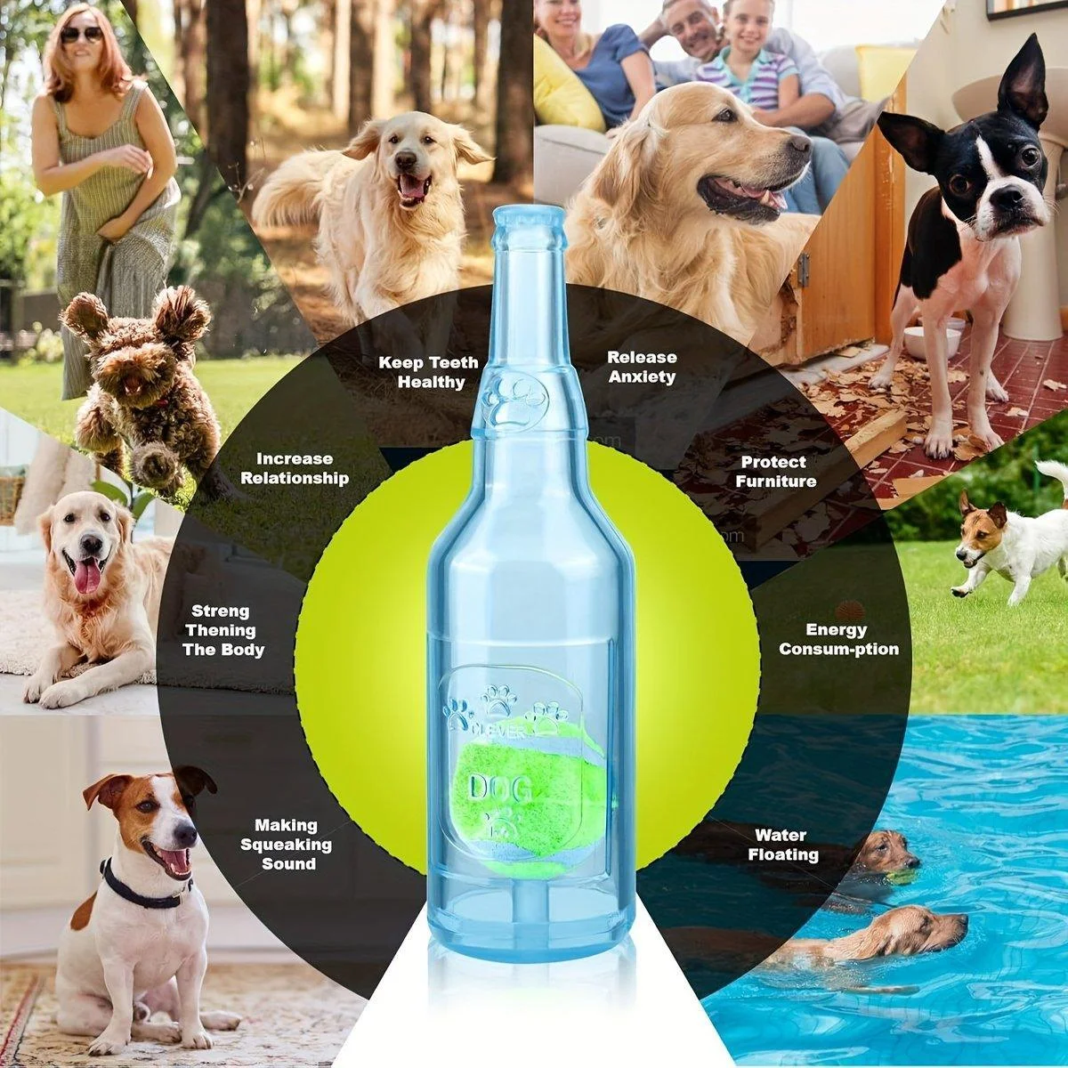 This playful and engaging dog toy is designed to look like a wine bottle, with a tennis ball enclosed inside, providing both entertainment and a teething solution for your furry friend. Made from durable, food-grade nylon, it is built to withstand the most enthusiastic chewers, helping to keep your pet’s teeth clean and healthy. This toy is perfect for interactive games like fetch or tug-of-war, and it even makes a squeaky sound when squeezed, adding excitement to playtime.