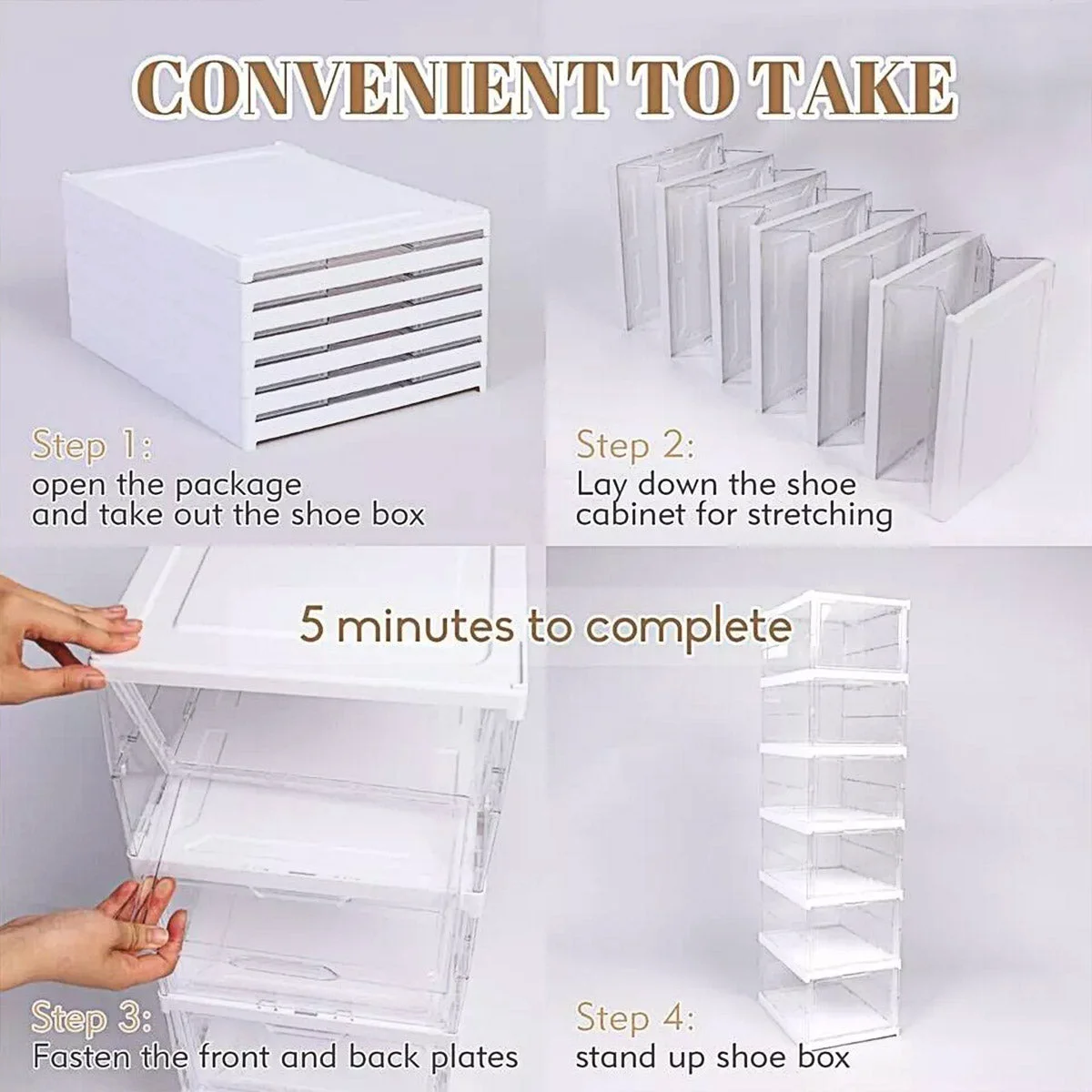 This foldable shoe storage rack provides a sleek and stackable solution for organising your footwear. Featuring a breathable back panel and a high transparency front door, each unit keeps shoes visible, well-ventilated, and protected from dust. Made of durable material, it's easy to assemble in minutes and perfect for closets, entryways or wardrobes.
