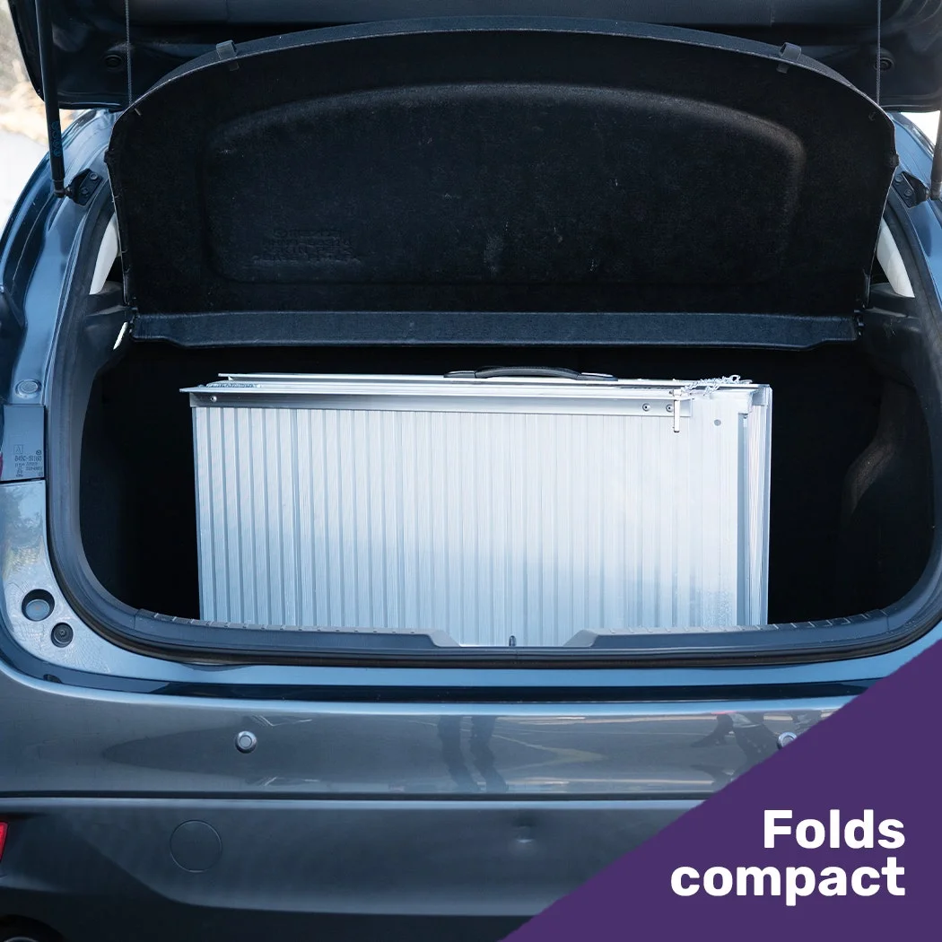 Equipmed ramps are expertly machine welded with non-slip serrated slats and side rails for peace of mind. The ramp comes complete with 2 x locking pins that keep it folded when carrying.
