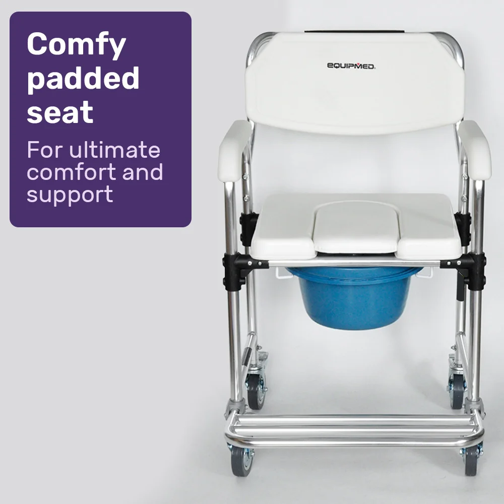 The Equipmed Rolling Commode Toilet Chair is an easy, convenient and practical way to accomplish all of your toileting needs with care and dignity, whether for you or a loved one.