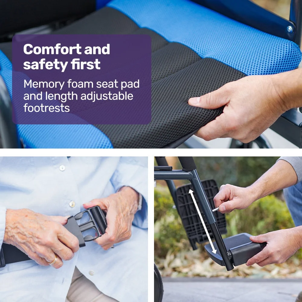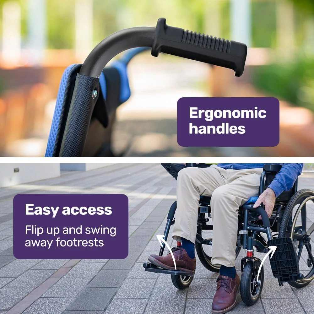 The large rear wheels glide smoothly over the bumps, and the tyres are puncture-proof and never require refilling with air! Theres also a hand rim which gives the option for it to be used as a manual wheelchair.
