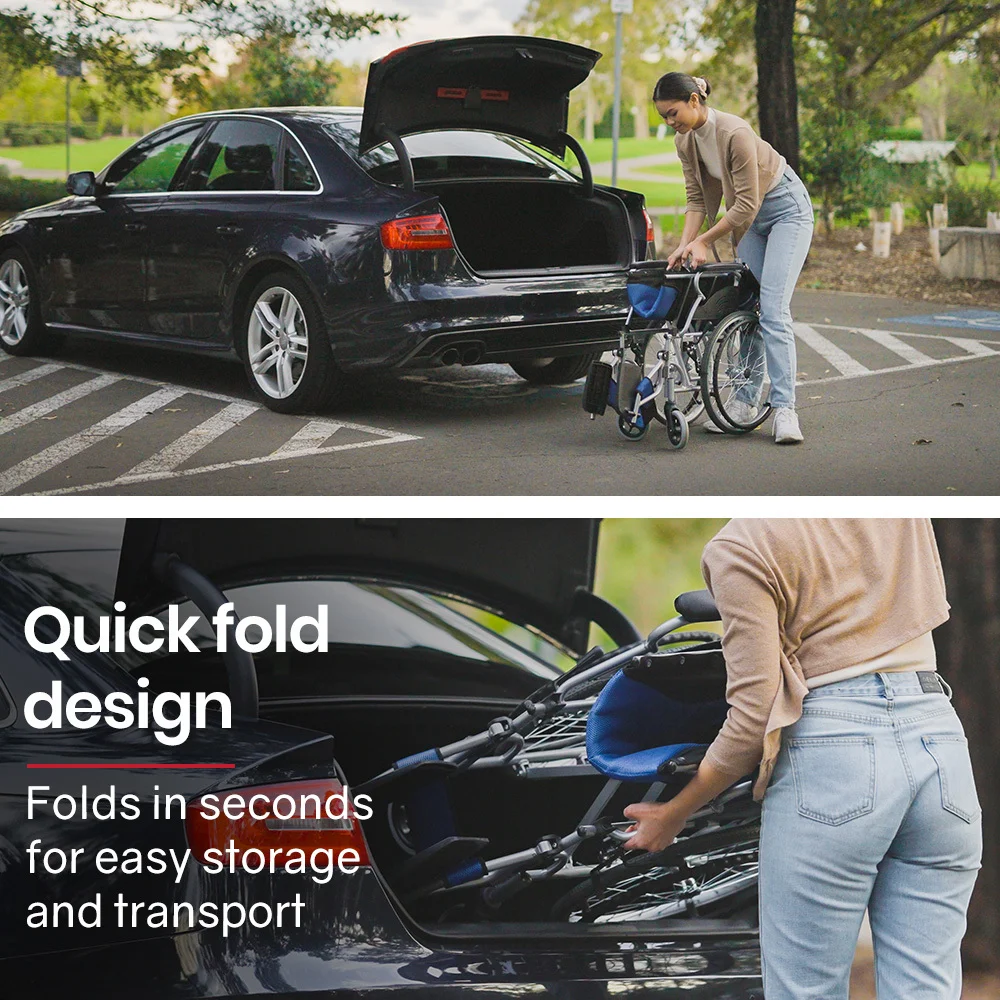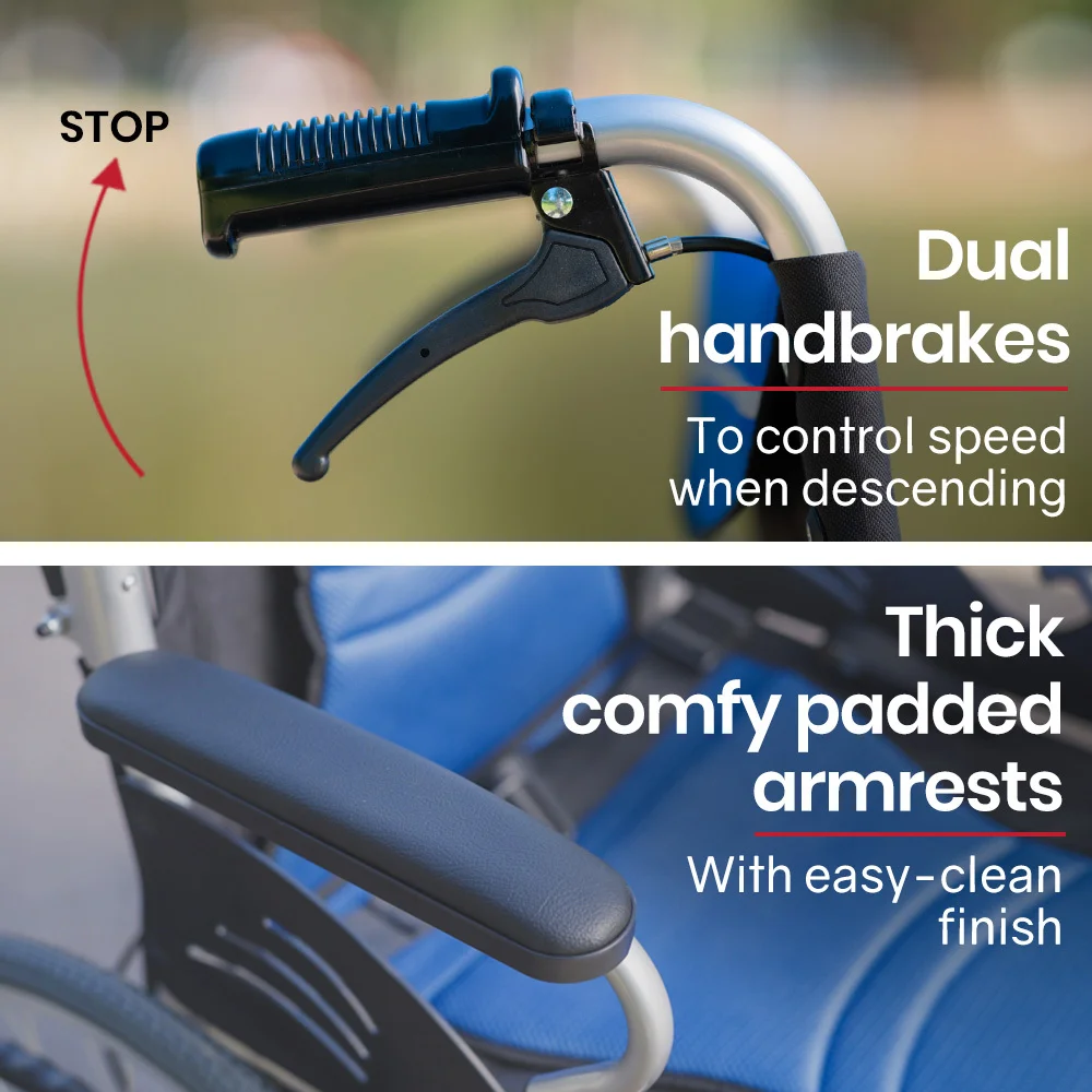 This premium lightweight wheelchair features fold up footrests allowing for access onto the wheelchair. The comfy padded seat and generously proportioned backrest ensure a comfortable ride. And, thanks to the 2 second folding action and ergonomic handles, it makes for a relaxing day out for any helpers, too! They can activate the easy access dual brakes to safely go down hills and ramps, while dual parking brakes can lock the wheels into position a perfect time to pull out some reading material from the backrest pouch!
