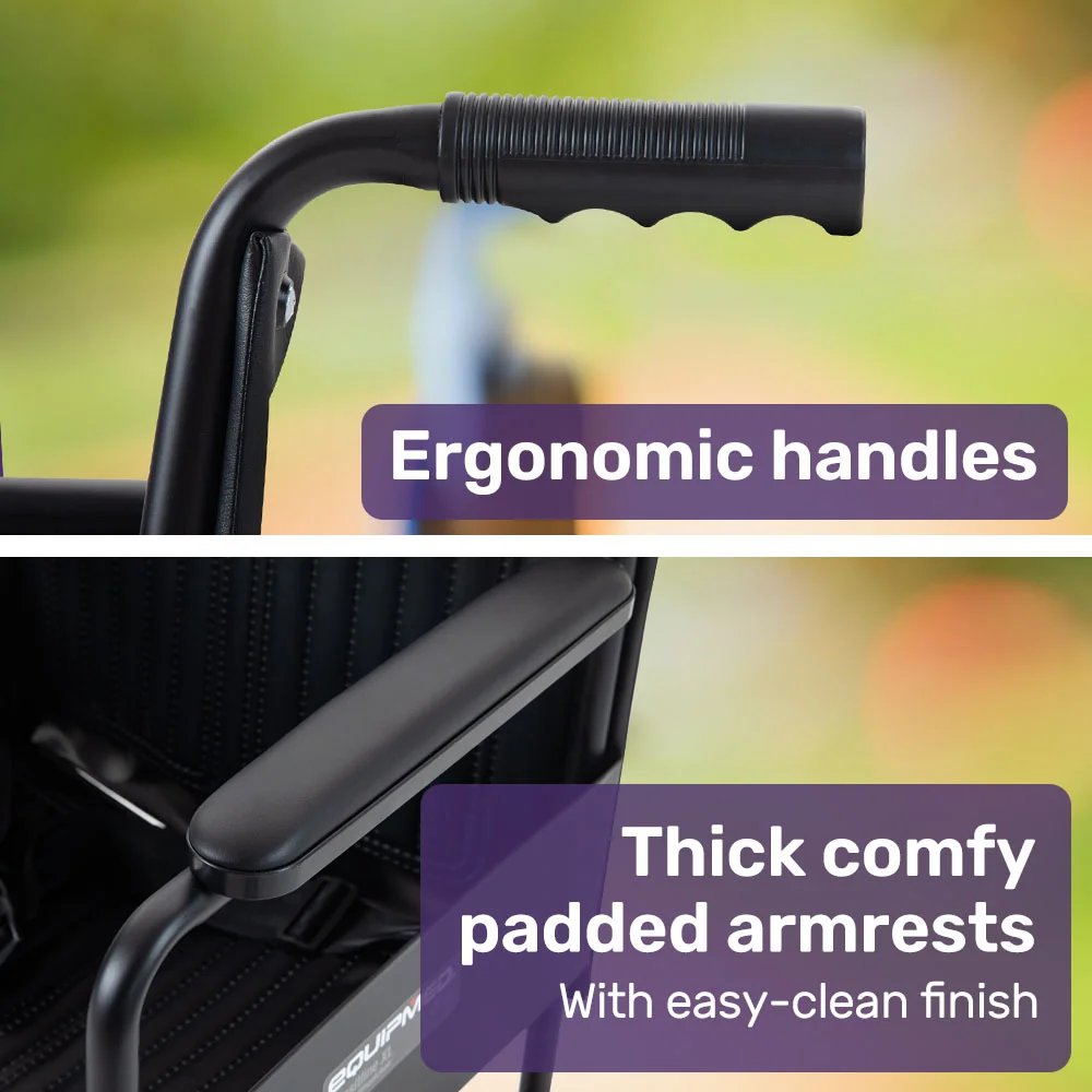 Designed for user comfort, the Equipmed Transport Wheelchair features swing up footrests for effortless access, extra wide 51cm seat, and plush padded armrests. The easy-clean vinyl material ensures quick maintenance, while the backrest storage pouch is handy for storing favourite reading material. Adjust the seat belt for a secure fit during short-term mobility needs, whether it's a trip to the park, doctor's appointments, or navigating airports with ease.