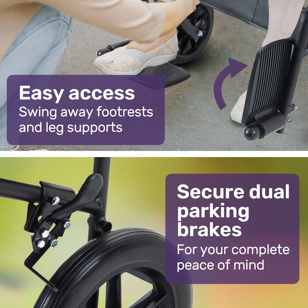 Thick 12-inch rear wheels ensure a smooth ride over bumps on a range of surfaces. Not only that, they also offer the practicality of not requiring to be refilled with air and will never experience a puncture! With a swift 2-second folding action, caregivers can easily transport this wheelchair wherever it's needed.