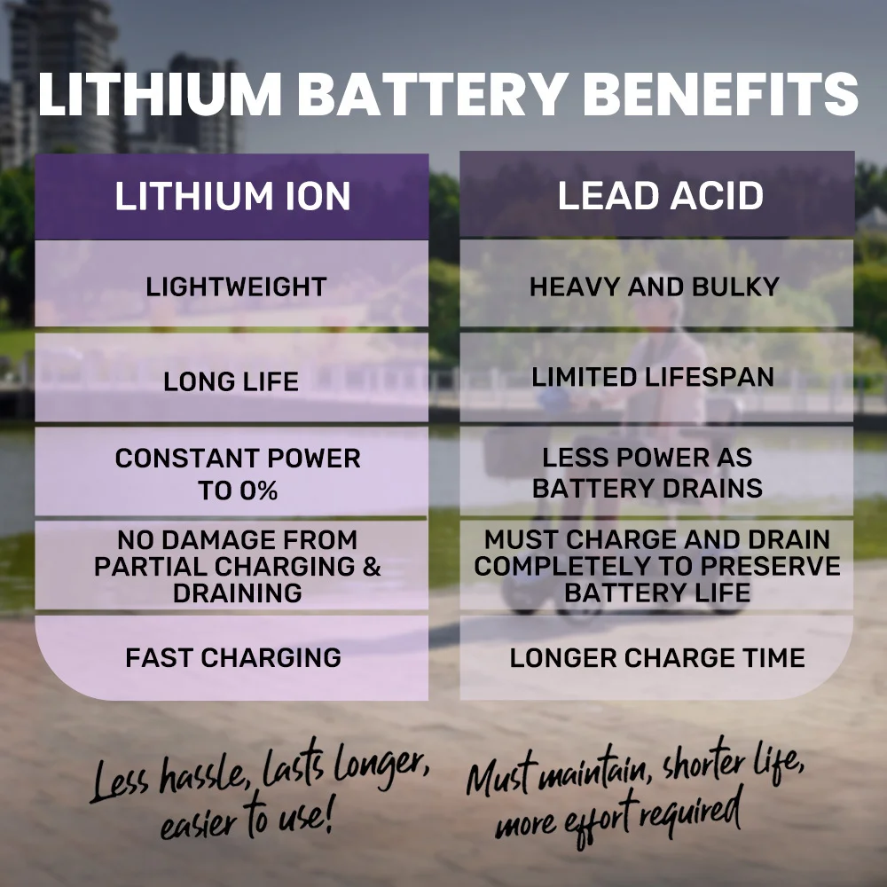 The FreeRoam+ features a lithium-ion battery, offering significant advantages over older lead-acid models. It requires no maintenance, charges faster, and can be topped up without damaging the battery life. This makes it much more convenient for both users and carers.