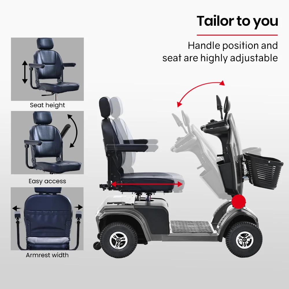 The controls are simple and intuitive for anyone to become familiar with. Getting on and off the scooter is possible with minimal fuss as the armrests are retractable, and the President's seat can also swivel to the side with the pull of a lever. The pivoting seat action also allows the option of dining at a table.