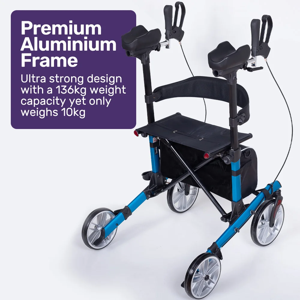 Crafted from lightweight aluminium, it supports up to 136kg, ensuring greater stability and durability. The rollator features 10' front wheels and 8' rear wheels to move over pavement, paths and even grass to give a smoother, easier ride. Flat-free TPE solid tyres and aluminium mag rims offer long-term reliability.