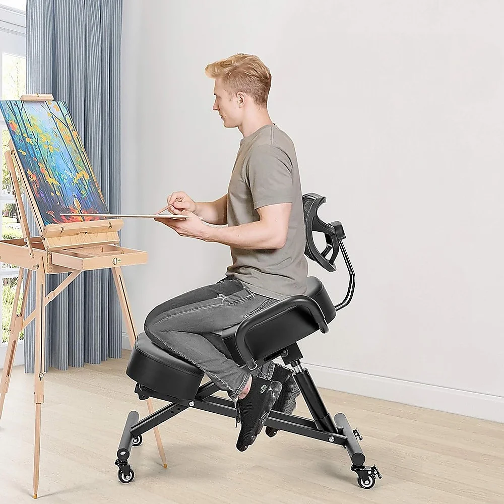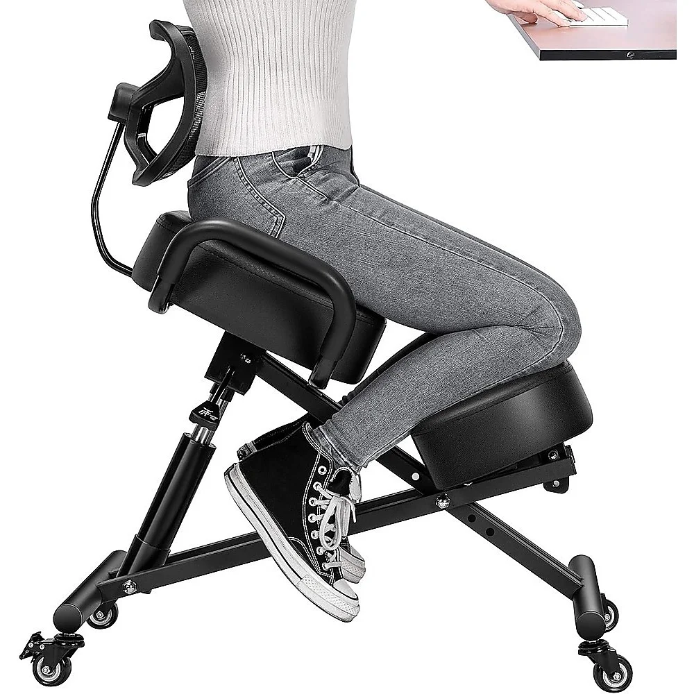This ergonomic kneeling chair with a backrest maintains your back at a comfortable angle, distributing pressure between the buttocks and legs. This effectively alleviates discomfort in the neck, back, and spine, allowing you to fully enjoy your workday.