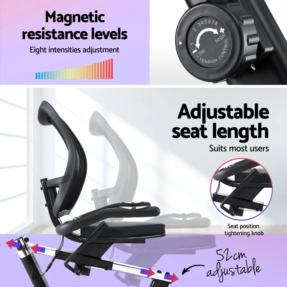Stay active and fit with the Everfit Recumbent Exercise Bike, designed for a smooth and enjoyable workout experience. Its industrial-strength frame and 6kg flywheel ensure stability and durability, while the silent magnetic system delivers a seamless, noise-free ride. With eight adjustable resistance levels, you can customise your workout intensity to match your fitness goals.