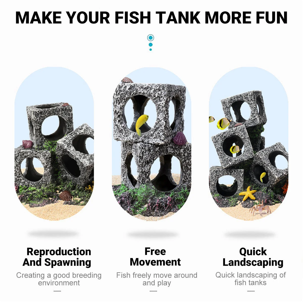 Create a more enriching aquatic environment with this square stone-style resin shelter, available in 2, 3, or 5-cube configurations. Designed to resemble natural rock, it offers hiding and breeding spaces for small fish, shrimp, and cichlids. The open circular design encourages movement, reduces stress, and supports a balanced ecosystem. Perfect for aquascaping, this shelter blends function and visual appeal for any freshwater or saltwater aquarium.
