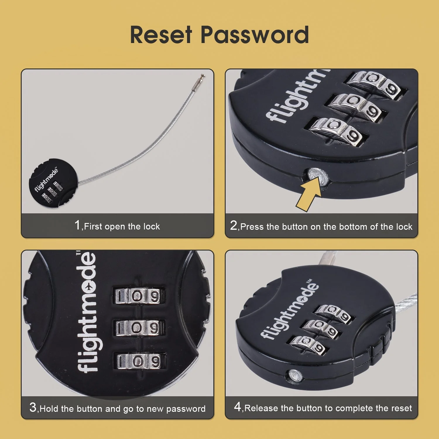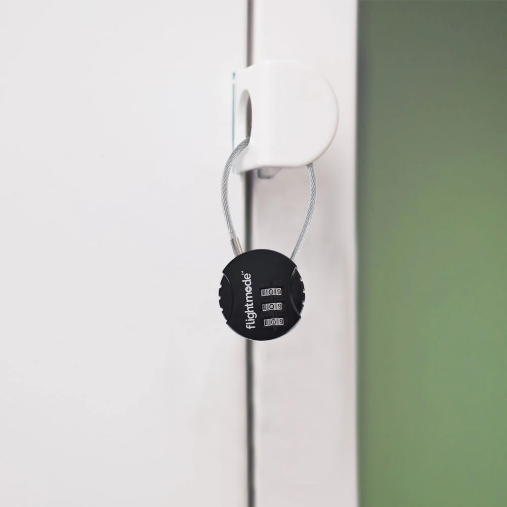 Place the lock so the flightmode logo is facing towards you. The lock's default combination is 0-0-0. Align the default combination with the engraved vertical line on the front of the lock. Make sure to accurately align the combination, as a small error will result in the lock not being able to be opened. Squeeze the sides of the lock and the cable will be released, a small tug might be required simultaneously. To reset the default combination, first, open the lock. Use a paperclip or pen tip to press the button on the base of the lock, continue to hold the button and turn the dials to a new combination. Release the button and the lock's combination is now set to your own personalised combination. Please make sure to remember your new combination as there is no way to reset the lock if the combination is forgotten.