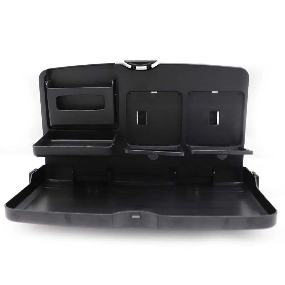 Multi-Purpose Design: Equipped with holders for drinks, mobile phones, and meals, this table serves as an ideal companion for eating, working, or organizing while in the car.