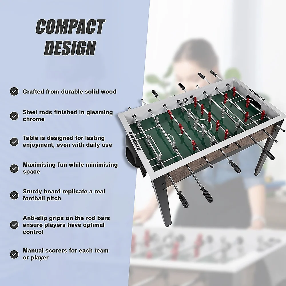 Maximising fun while minimising space, this table boasts a compact design. The sturdy board replicate a real football pitch, and anti-slip grips on the rod bars ensure players have optimal control. Keep score easily with manual scorers for each team or player. Quick and straight-forward setup means you can start playing right away, and it comes complete with everything you need to put it together. When the weather's fine, take the excitement outdoors and bask in the sun while enjoying your favourite table game. Whether it's for a holiday or birthday, this foosball table is a fantastic gift for kids, partners, friends, or the entire family. Buy yours today!