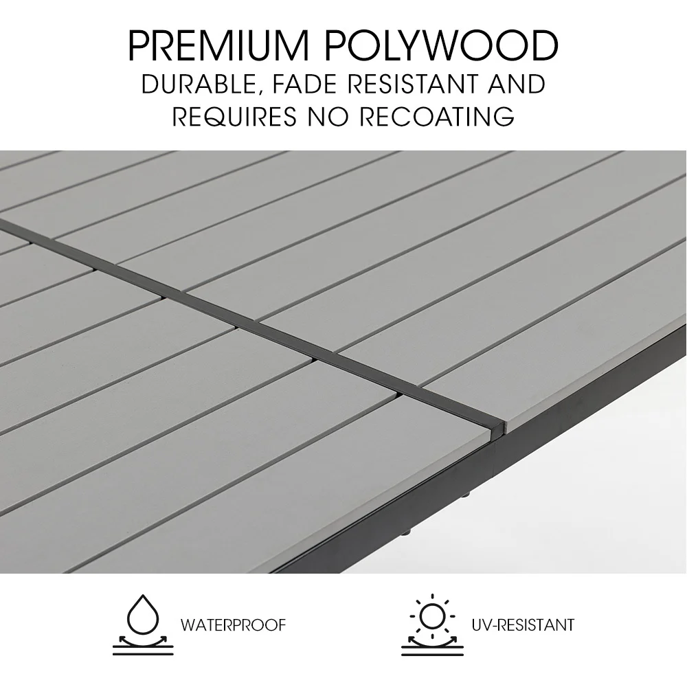 Crafted from premium polywood, ensuring durability, fade resistance, and without the need for any upkeep. The Fortia Outdoor Dining Table has a strong stylish, rust-resistant powder-coated frame and non-marking feet to protect surfaces like tiles or decking.