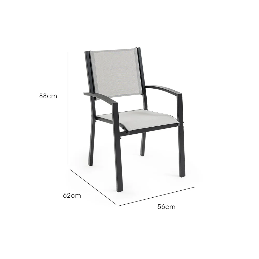 Designed for warm climates, the set features breathable mesh fabric, ensuring well-ventilated comfort, fade resistance, and longevity. The Fortia 6-Piece Outdoor Dining Chair Set has a strong stylish, rust-resistant powder-coated frame and non-marking feet to protect surfaces like tiles or decking.