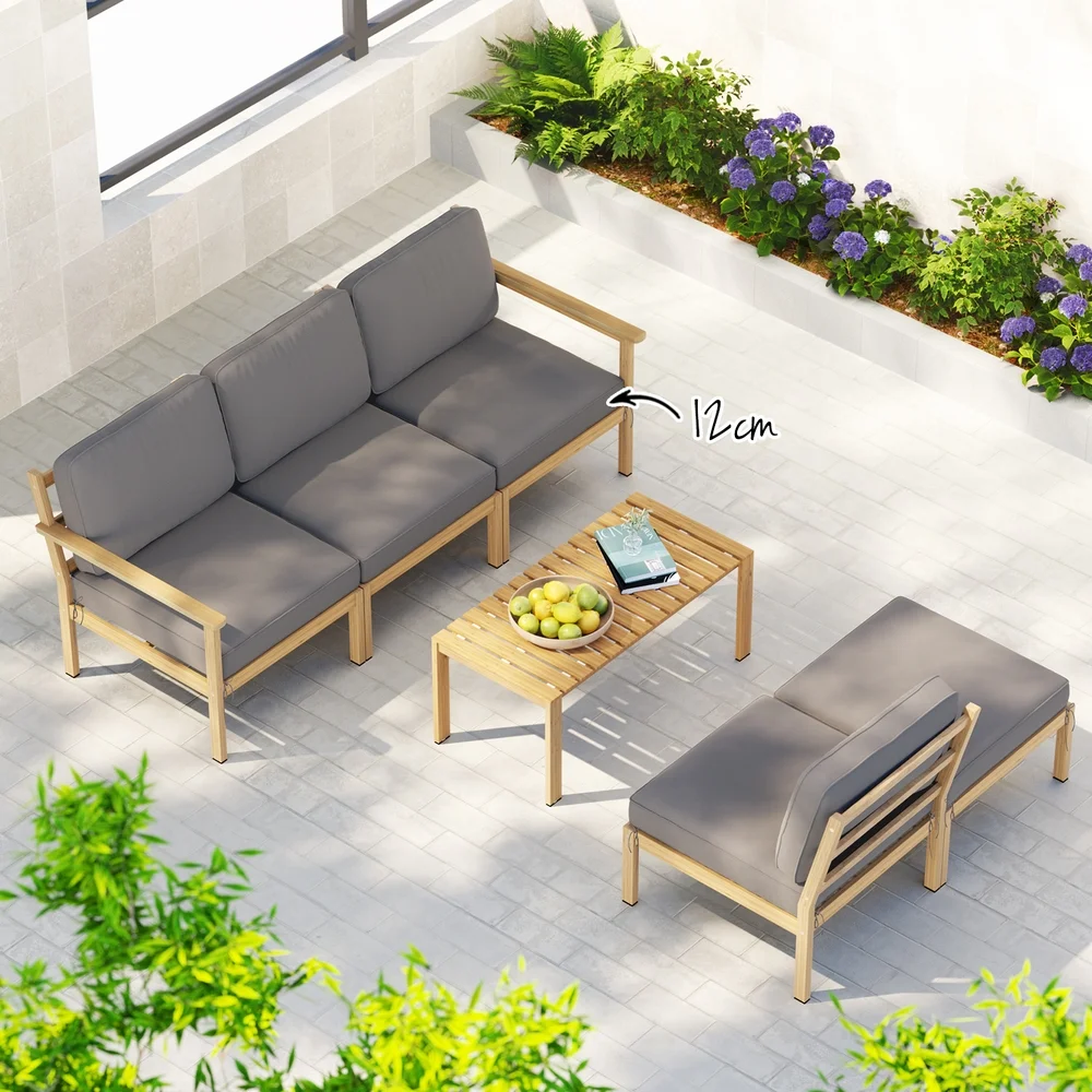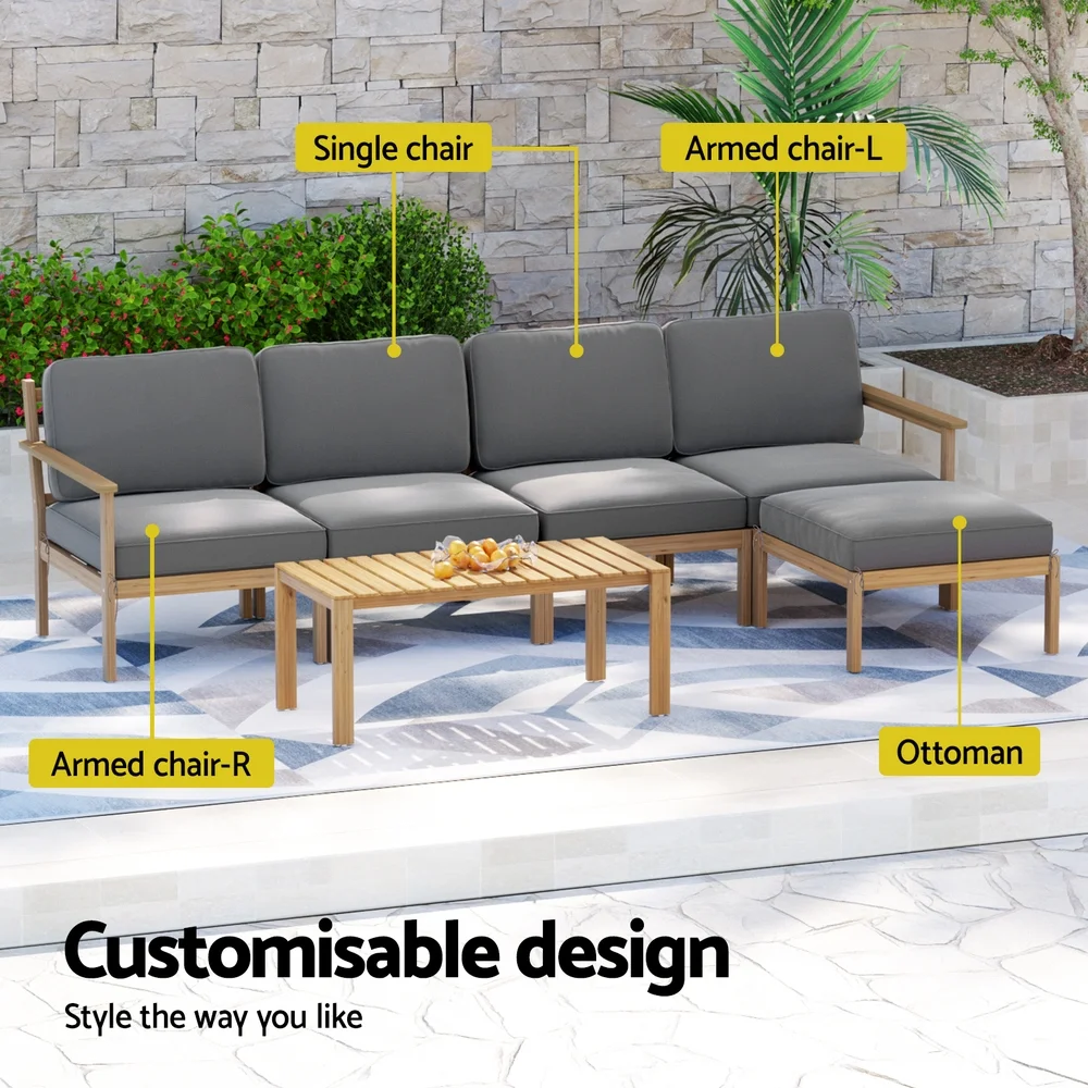 Get outdoors just in time for summer with the Gardeon 5-seater Outdoor Sofa Set. Featuring single sofa, armed sofa, a wide coffee table and an ottoman, there's plenty of space for the whole family. The conversation sofa set is easy to assemble, and you can easily configure the seating into your perfect outdoor set-up. The set uses solid wood, while the outdoor cushions feature water-resistant, UV-resistant covers, and a thick high-density foam core for comfort. The tabletop's slatted design easily drains during wet weather and has plenty of room to hold your outdoor essentials. Maintenance is as easy as wiping down the furniture, and you can remove the cushion covers for even easier cleaning. So what are you waiting for? Make the most out of the beautiful weather with a Gardeon 5-seater Outdoor Sofa Set.