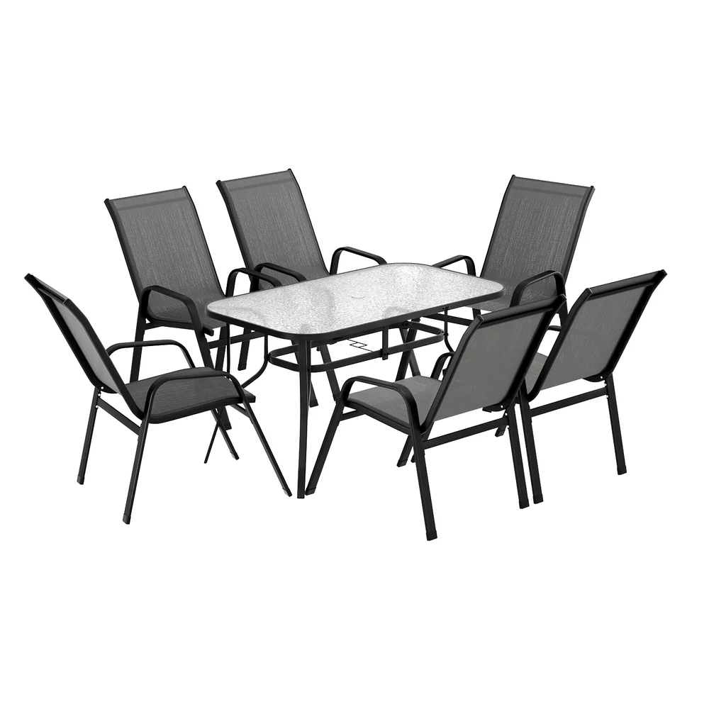 Elevate your outdoor living with the Gardeon 7 Piece Mesh Dining Set—perfect for sunny gatherings in fresh air! The rust-proof powder-coated steel frame ensures lasting durability, while the all-weather synthetic fabric resists sun, rain, and stains, keeping colors vibrant for years. The spacious tempered glass table features a convenient parasol hole for shade, and the stackable chairs maximize storage space. Floor protectors safeguard your surfaces while providing stability on uneven ground. With its sleek, versatile design, this set transitions seamlessly from patio to indoor dining. Low-maintenance and built for comfort, the Gardeon dining set is ideal for relaxing meals with family and friends under the open sky!