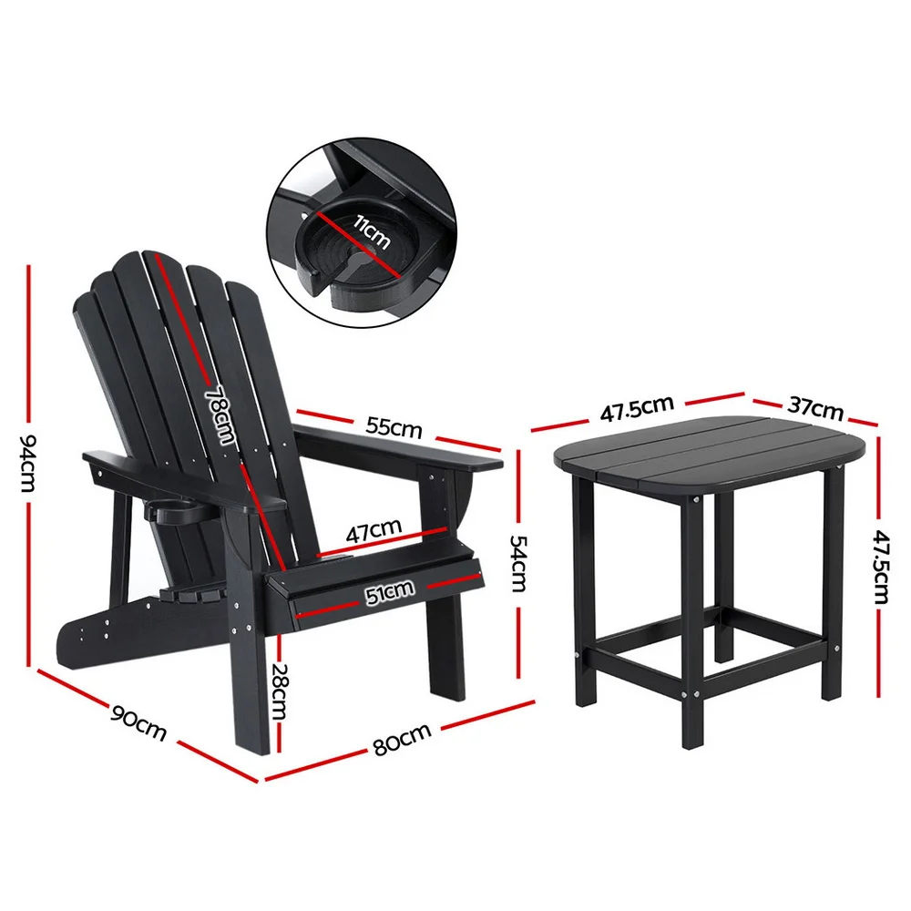 Upgrade your outdoor space with this durable HDPE 3-piece set��perfect for patios, gardens, or poolside relaxation! The side table features weatherproof, fade-resistant HDPE, a 91kg load capacity, water-draining slats, and safety-curved edges��zero maintenance, just wipe clean. Pair it with two Gardeon Adirondack chairs, designed for comfort with 103�� reclined backrests, wide armrests, and 11cm cup holders. Made of crack-resistant HDPE, each chair supports 170kg with reinforced triangular frames and rustproof stainless steel screws. Both chairs and table are weatherproof, fade-resistant, and easy to assemble (tools included). Customize with paint or enjoy hassle-free cleaning (soap + water). Ideal for outdoor lounging!