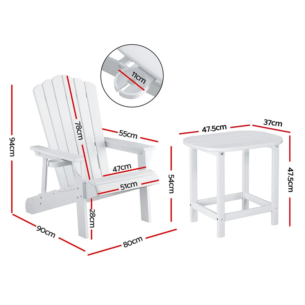 Upgrade your outdoor space with this durable HDPE 3-piece set��perfect for patios, gardens, or poolside relaxation! The side table features weatherproof, fade-resistant HDPE, a 91kg load capacity, water-draining slats, and safety-curved edges��zero maintenance, just wipe clean. Pair it with two Gardeon Adirondack chairs, designed for comfort with 103�� reclined backrests, wide armrests, and 11cm cup holders. Made of crack-resistant HDPE, each chair supports 170kg with reinforced triangular frames and rustproof stainless steel screws. Both chairs and table are weatherproof, fade-resistant, and easy to assemble (tools included). Customize with paint or enjoy hassle-free cleaning (soap + water). Ideal for outdoor lounging!