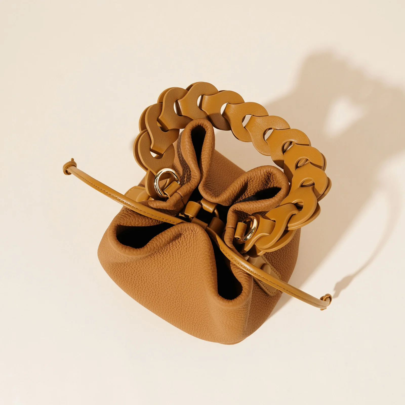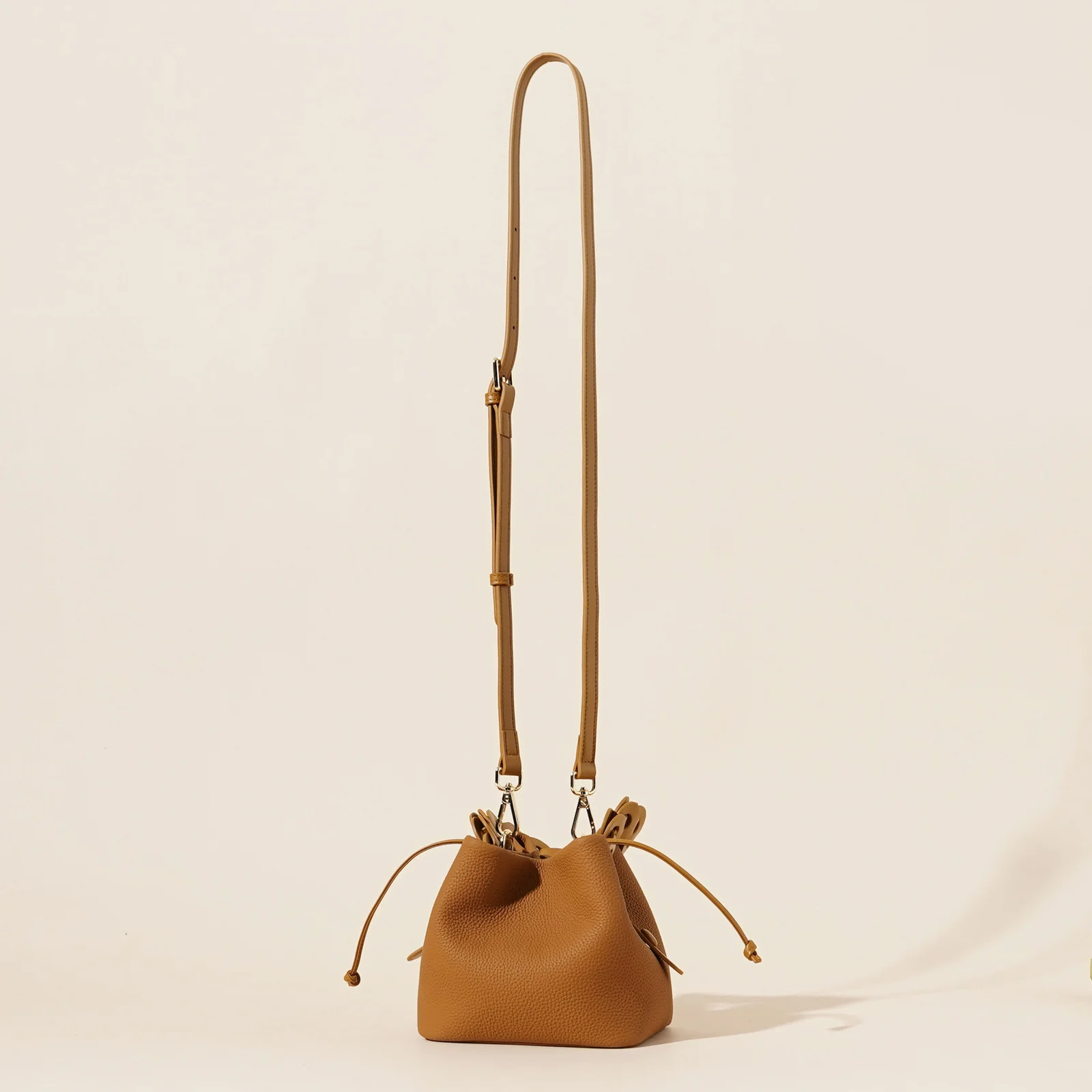 Make a chic statement with this exquisite Mini Bucket Bag, beautifully crafted from soft, pebbled genuine leather. This versatile bag combines the timeless appeal of a bucket bag with modern, artistic details. It features a unique, intricately braided top handle that adds a touch of sophisticated craftsmanship. For versatile styling, it also includes a detachable and adjustable long shoulder strap, allowing it to be worn as a crossbody or shoulder bag. The bag secures with a classic drawstring closure, complemented by a magnetic snap button for added security. Inside, the lined interior includes a small slip pocket to keep your essentials organized. Its compact size is perfect for carrying your phone, wallet, keys, and makeup.