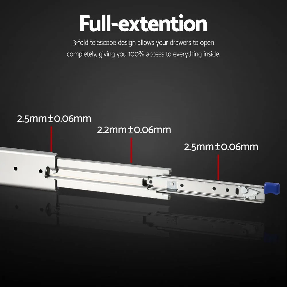 The Giantz Heavy Duty Drawer Slides come as a pair, measuring 76mm in width and 19.5mm in thickness, with a full extension range from 1804mm to 3608mm. The three-section ball bearing design ensures smooth and quiet sliding.The secure lock-in and lock-out mechanism keeps drawers safely fixed in the fully closed or fully extended position, preventing accidental overextension or detachment from the tracks. Crafted from robust cold rolled steel with a corrosion-resistant zinc plated finish, these slides support up to 227kg load capacity, providing reliable strength for heavy storage.Ideal for large drawers, cabinets, industrial storage, vehicle fit-outs, and multimedia equipment, these slides are versatile and built to last. Each set includes two slides, 12 x M5 screws, and 12 x M5 screw nuts as a bonus for easy installation.