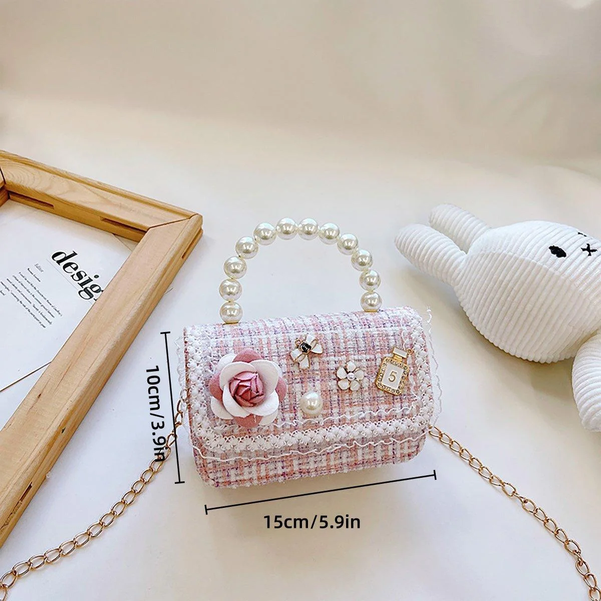 Material: Premium fabric with pearl handle and floral accents