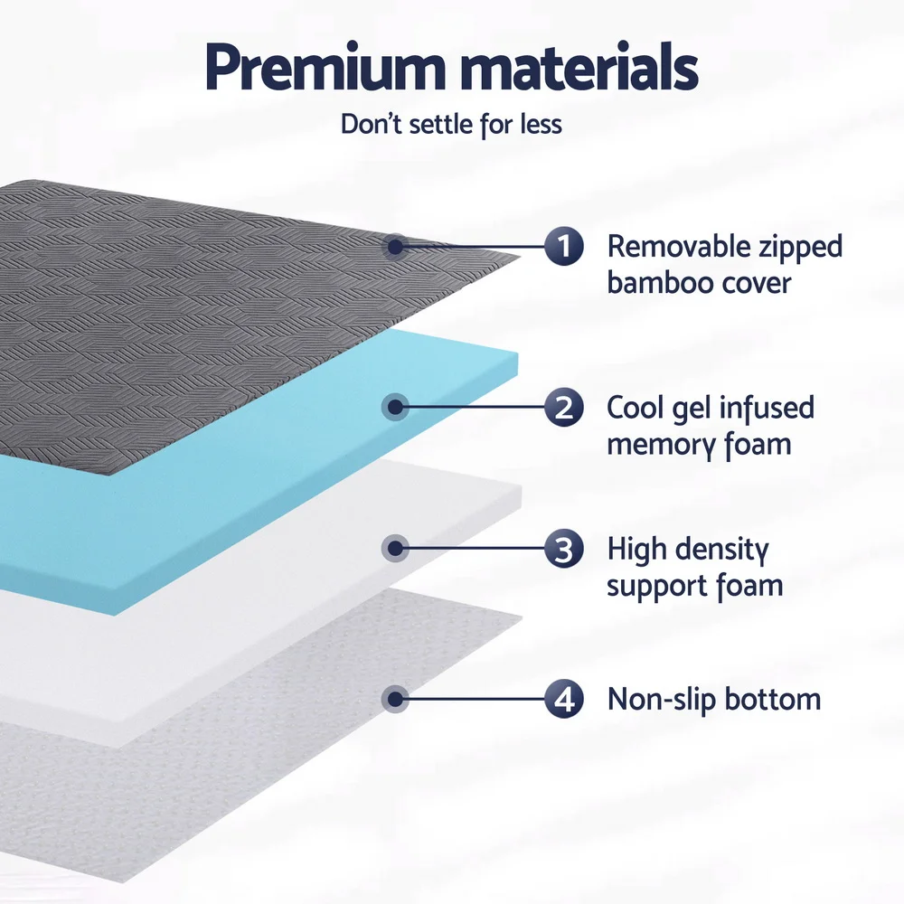 Experience restful sleep with this 8cm thick memory foam mattress topper from Giselle Bedding. Designed with dual-layer gel memory foam and a high-density base, it offers pressure relief and motion isolation. The bamboo cover is breathable, washable and secure.