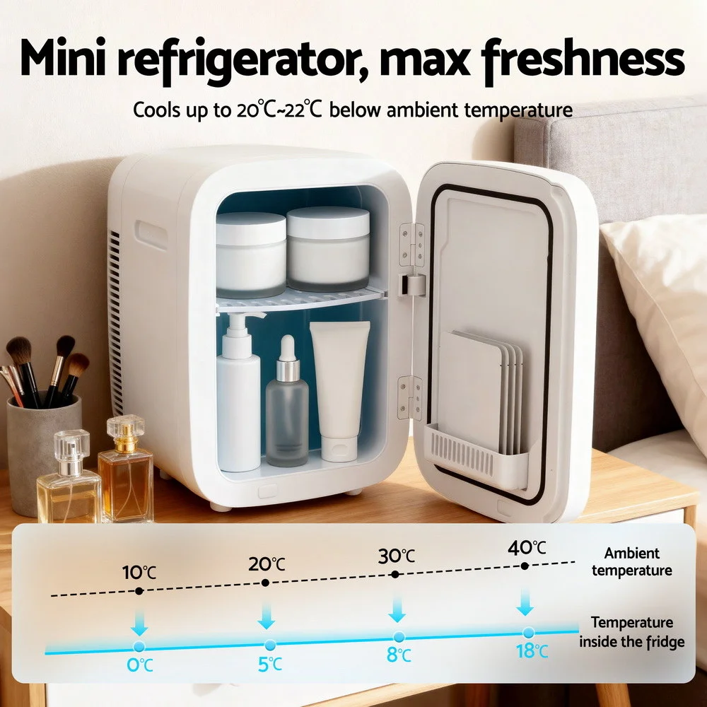 Transform your daily routine with this versatile mini fridge, the perfect solution for keeping your essentials at the ideal temperature. Featuring dual cooling and heating functions, it chills contents to 22℃ below ambient or warms them up to 60℃. This flexibility makes it perfect for preserving your skincare products, cosmetics, drinks, and snacks all year round. With a compact capacity, the fridge offers smart storage with a sleek, modern design. Its tempered glass and magnetic door keep your items neatly organized and easily accessible.Designed for true portability, this fridge offers flexible power options, operating seamlessly on both a 12V car socket and a 220V home outlet. This ensures reliable cooling and warming whether you're at home, in the office, or on a trip. What's more, its quiet semiconductor system provides a peaceful environment, making this stylish and practical appliance the perfect addition to any personal space.
