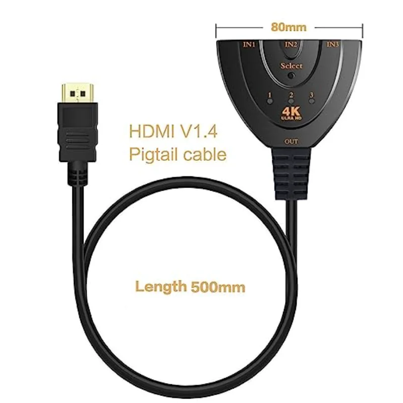 - 3 HDMI ports in and 1 HDMI out for various HDMI devices. Expand the capabilities of your HDTV, connect up to 3 HDMI compatible devices for seamless transitions without external power required. HDMI CABLE LENGTH IS 0.50CM.