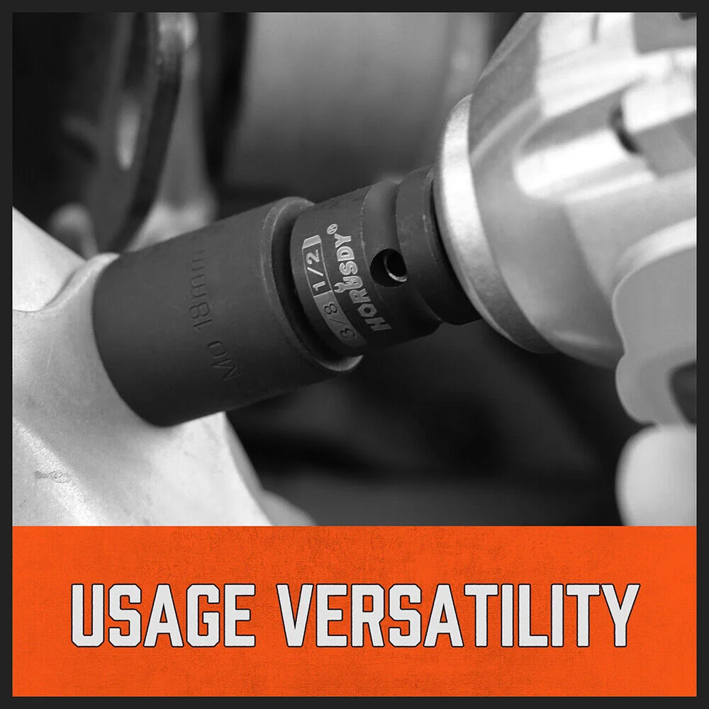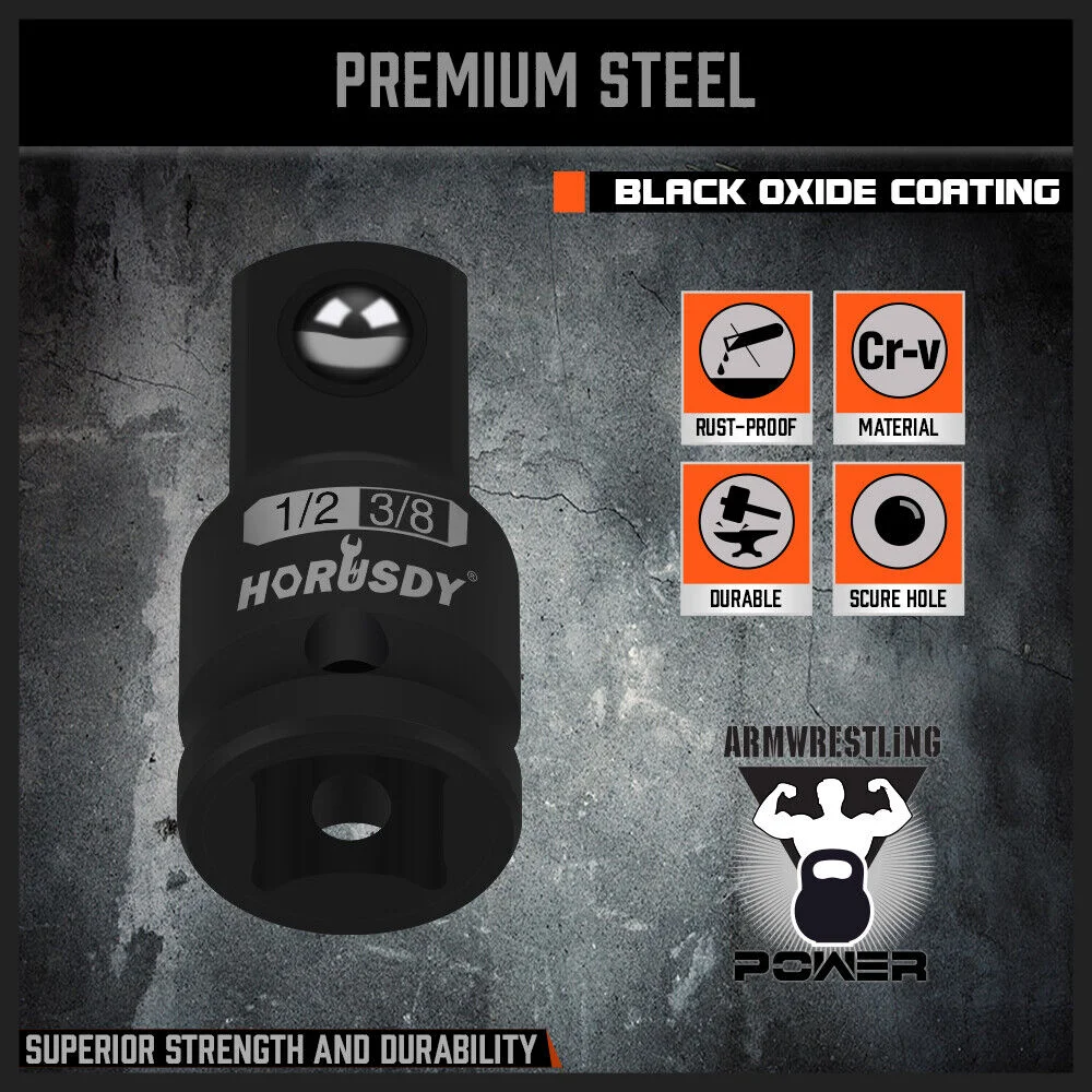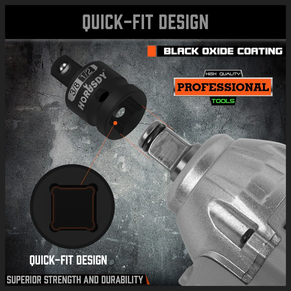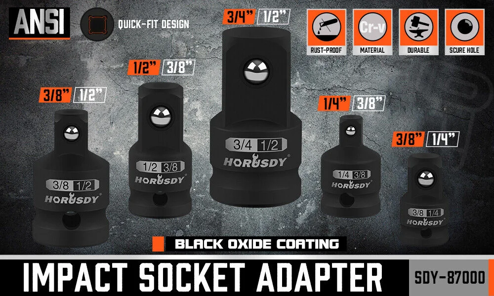 5PCS SET INCLUDES: 2 reducers in 3/8” female to 1/4” male and 1/2” female to 3/8” female. 3 adapters in 1/4" female to 3/8” male, 3/8”female to 1/2” male, 1/2"female to 3/4” male to convert all your impacts to different size sockets.